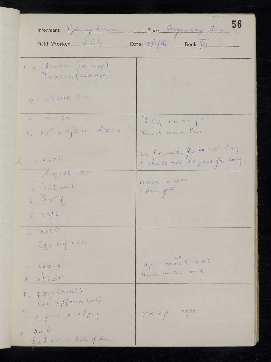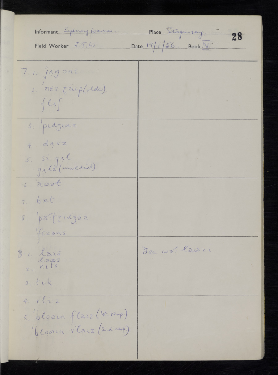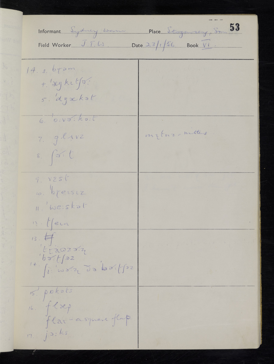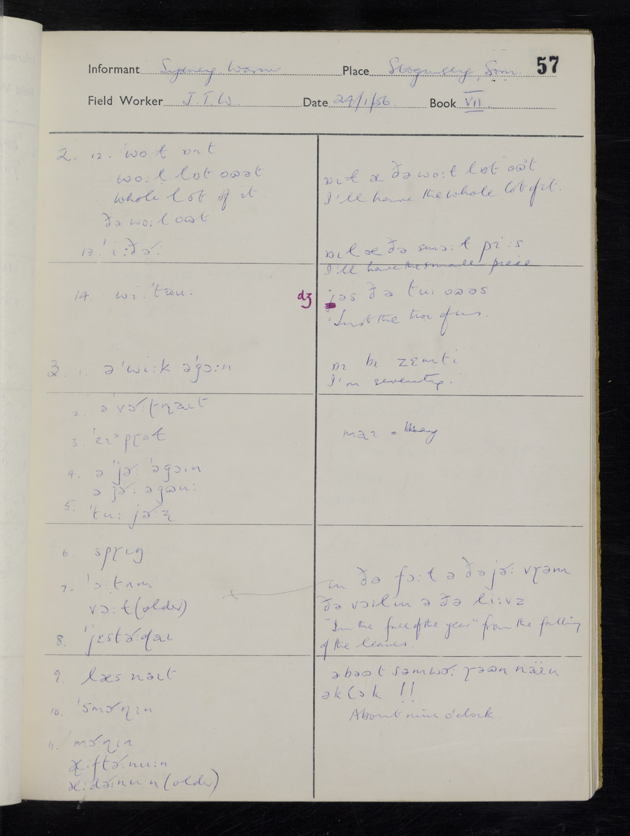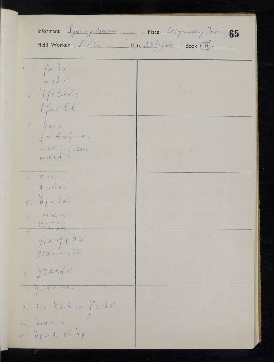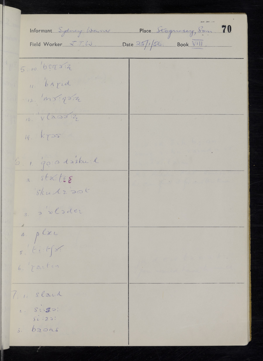 Interviews have been carried out by fieldworker John Wright. There are two informants for this response book - Tom Coles and Sydney Vaughan Warner. Their responses can be found in the following books: Tom Coles - I, II, III Sydney Warner - IV, V, VI, VII, VIII, IX