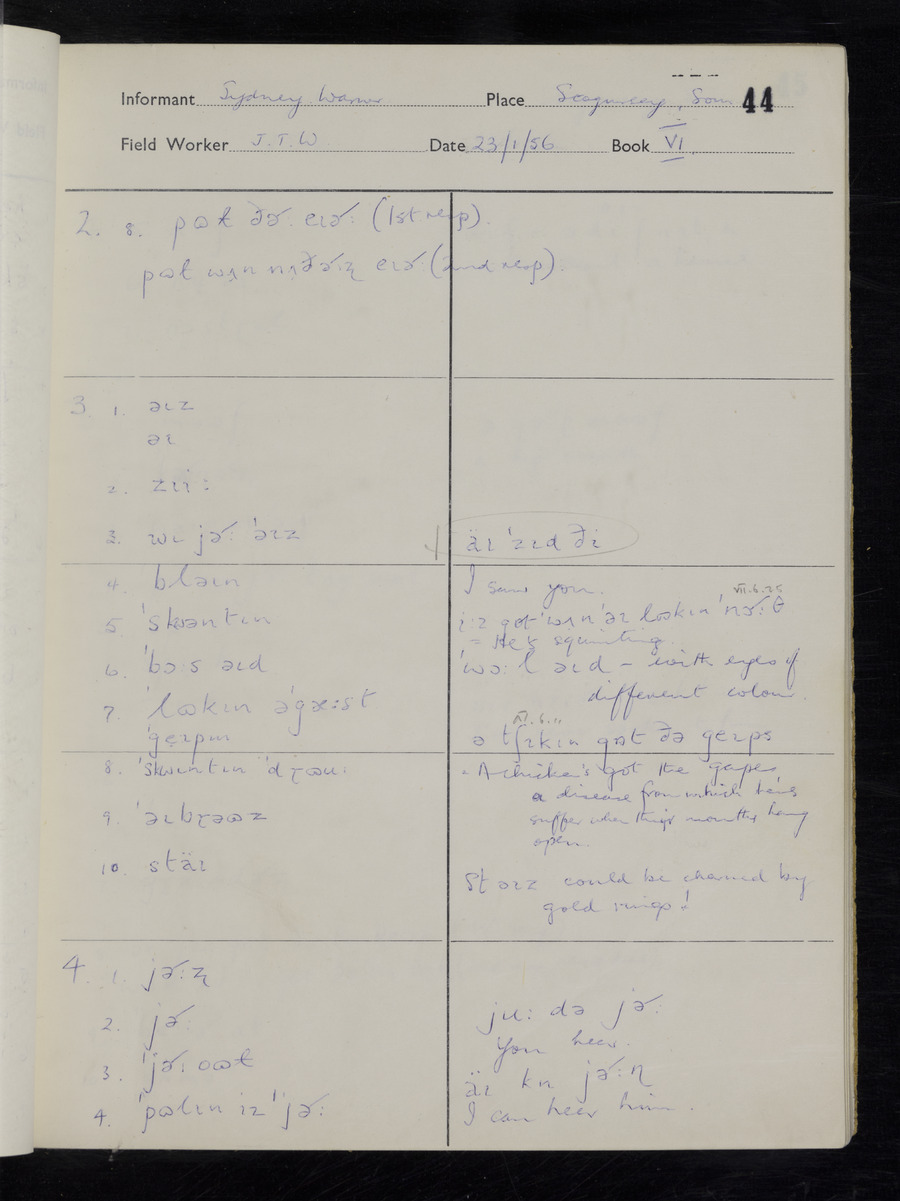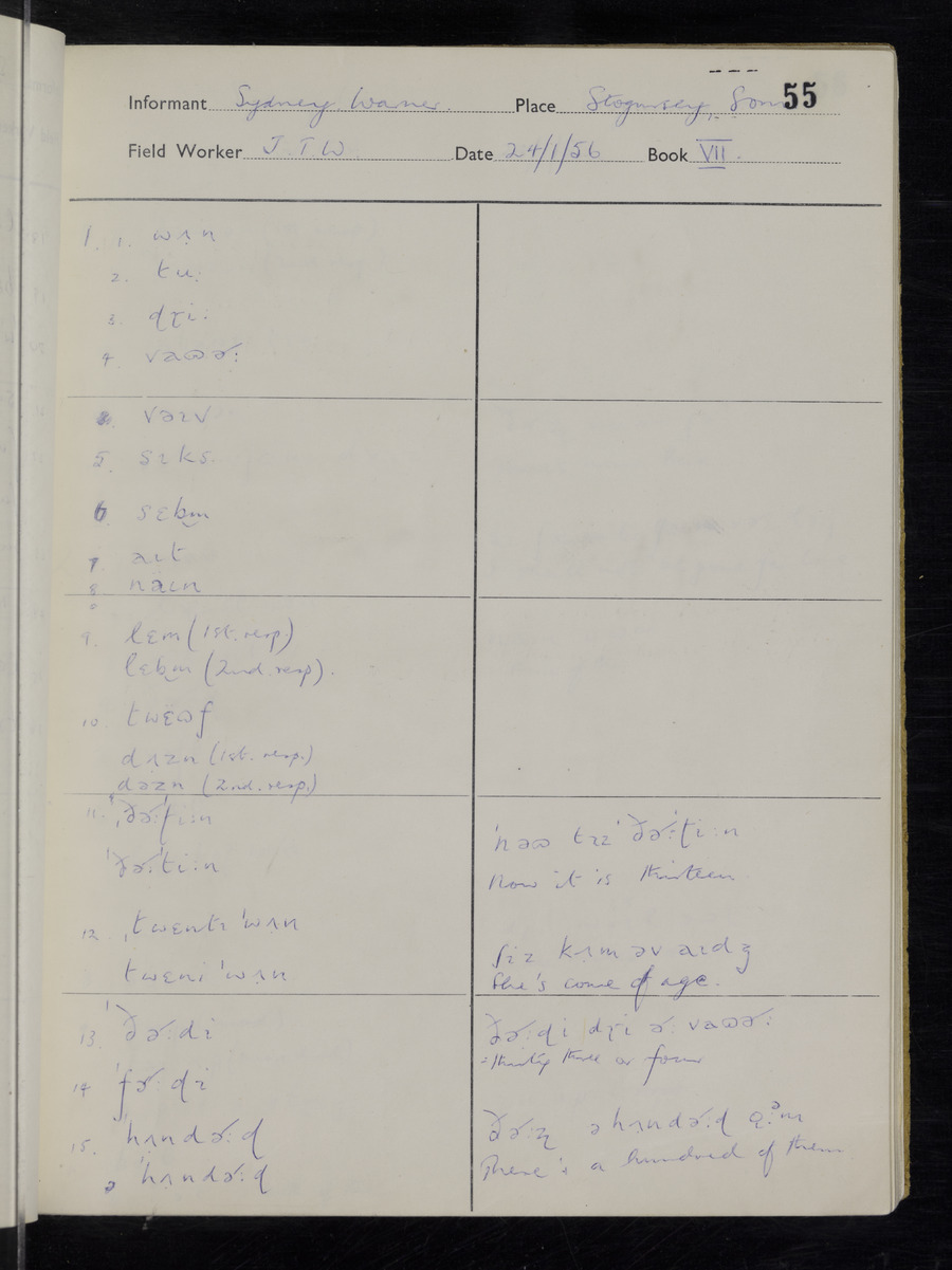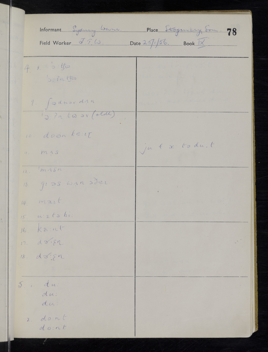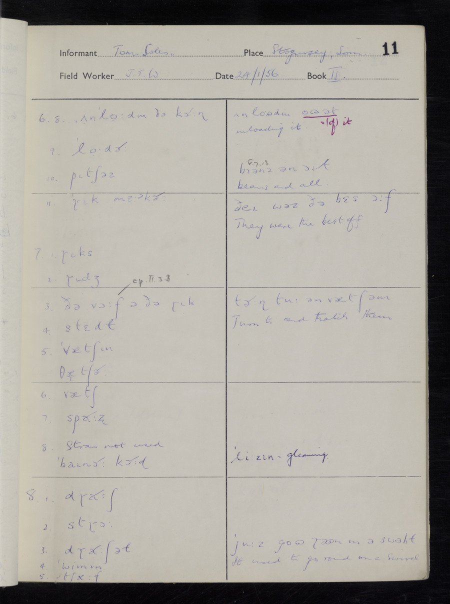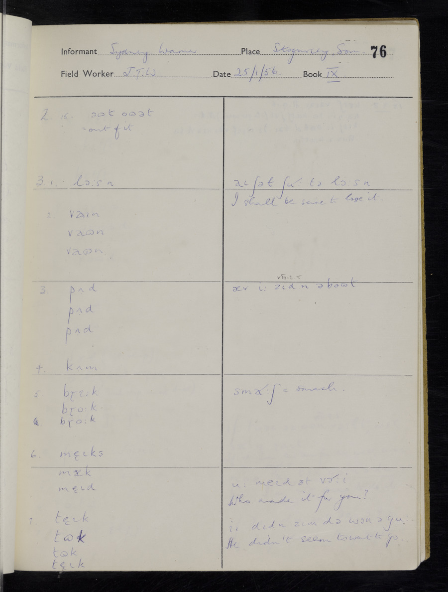 Interviews have been carried out by fieldworker John Wright. There are two informants for this response book - Tom Coles and Sydney Vaughan Warner. Their responses can be found in the following books: Tom Coles - I, II, III Sydney Warner - IV, V, VI, VII, VIII, IX