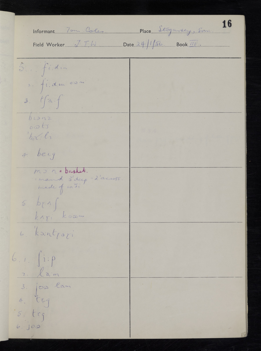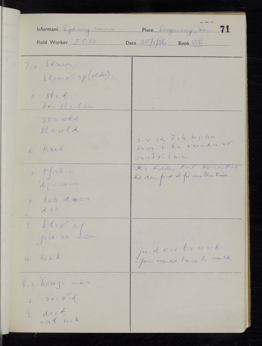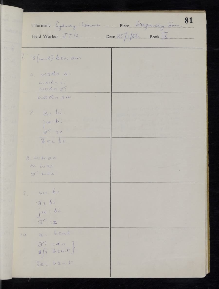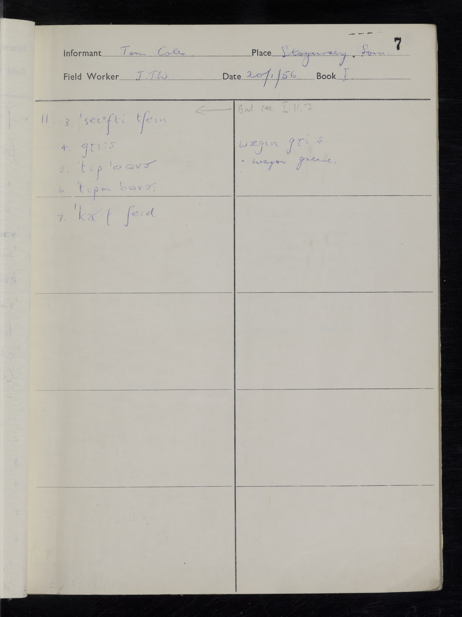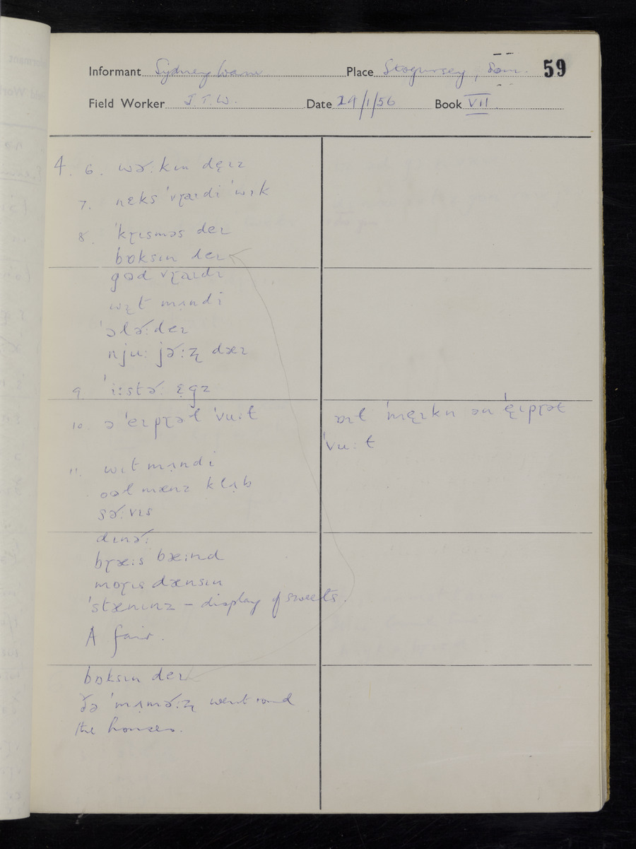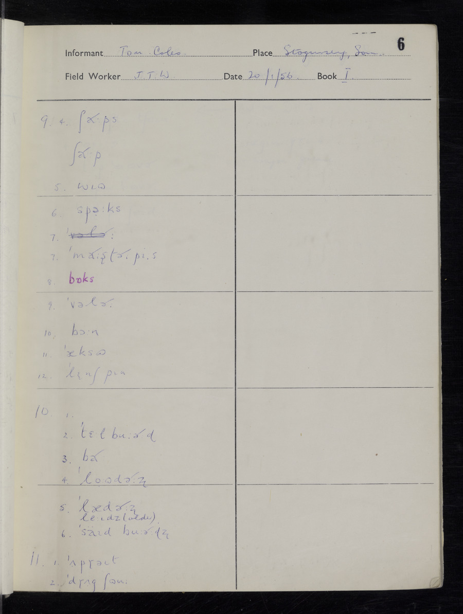 Interviews have been carried out by fieldworker John Wright. There are two informants for this response book - Tom Coles and Sydney Vaughan Warner. Their responses can be found in the following books: Tom Coles - I, II, III Sydney Warner - IV, V, VI, VII, VIII, IX