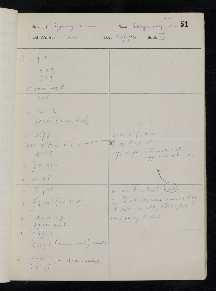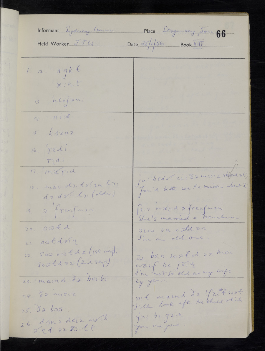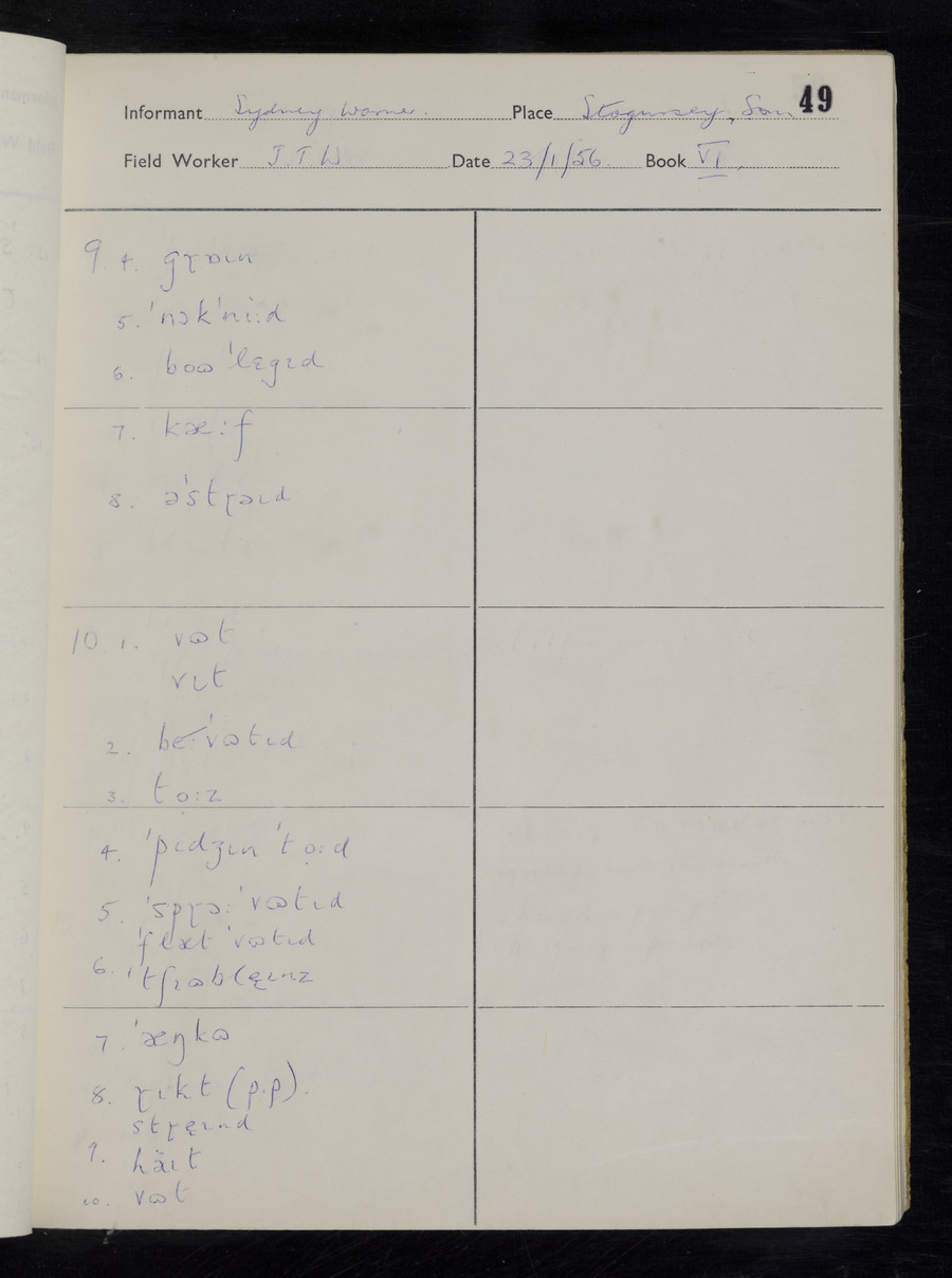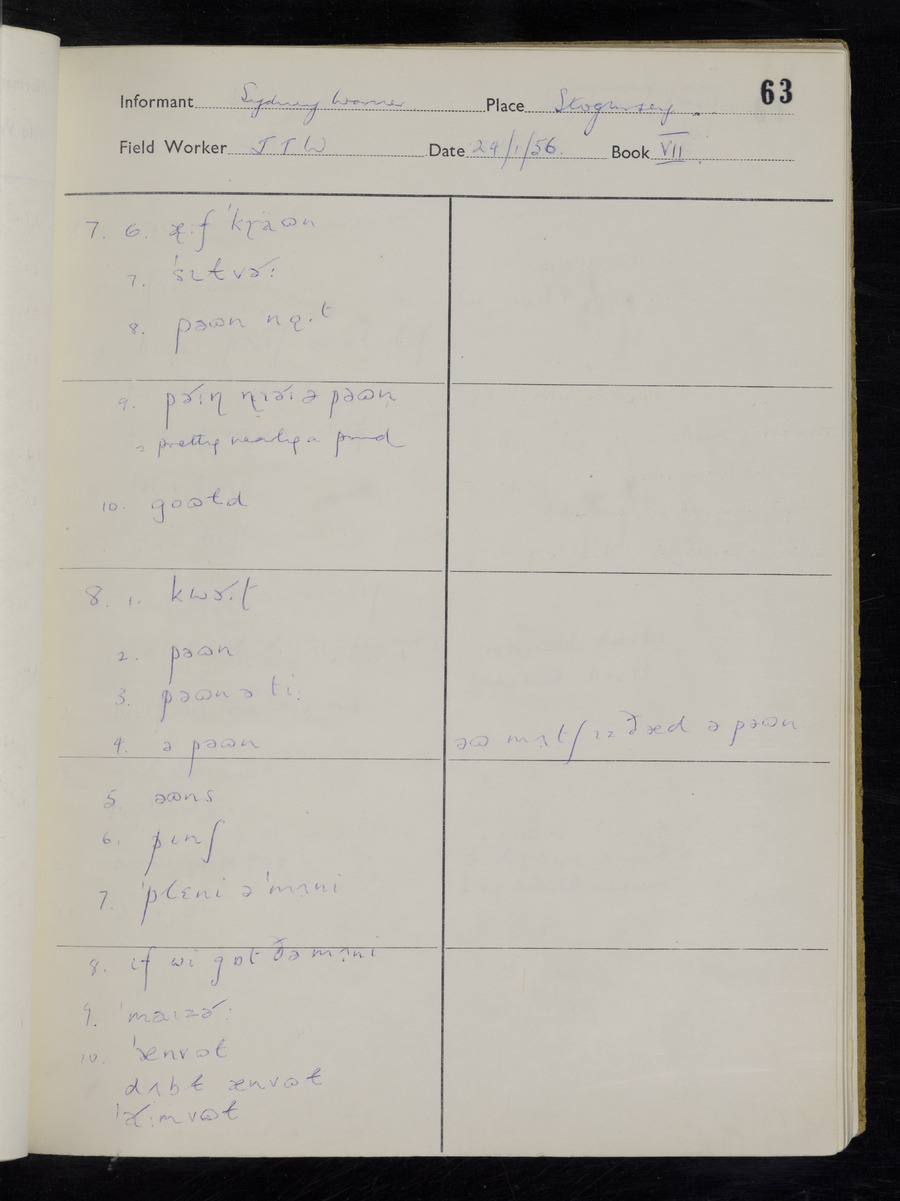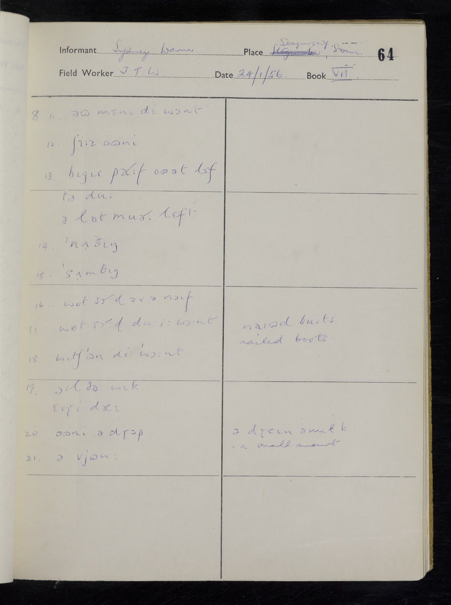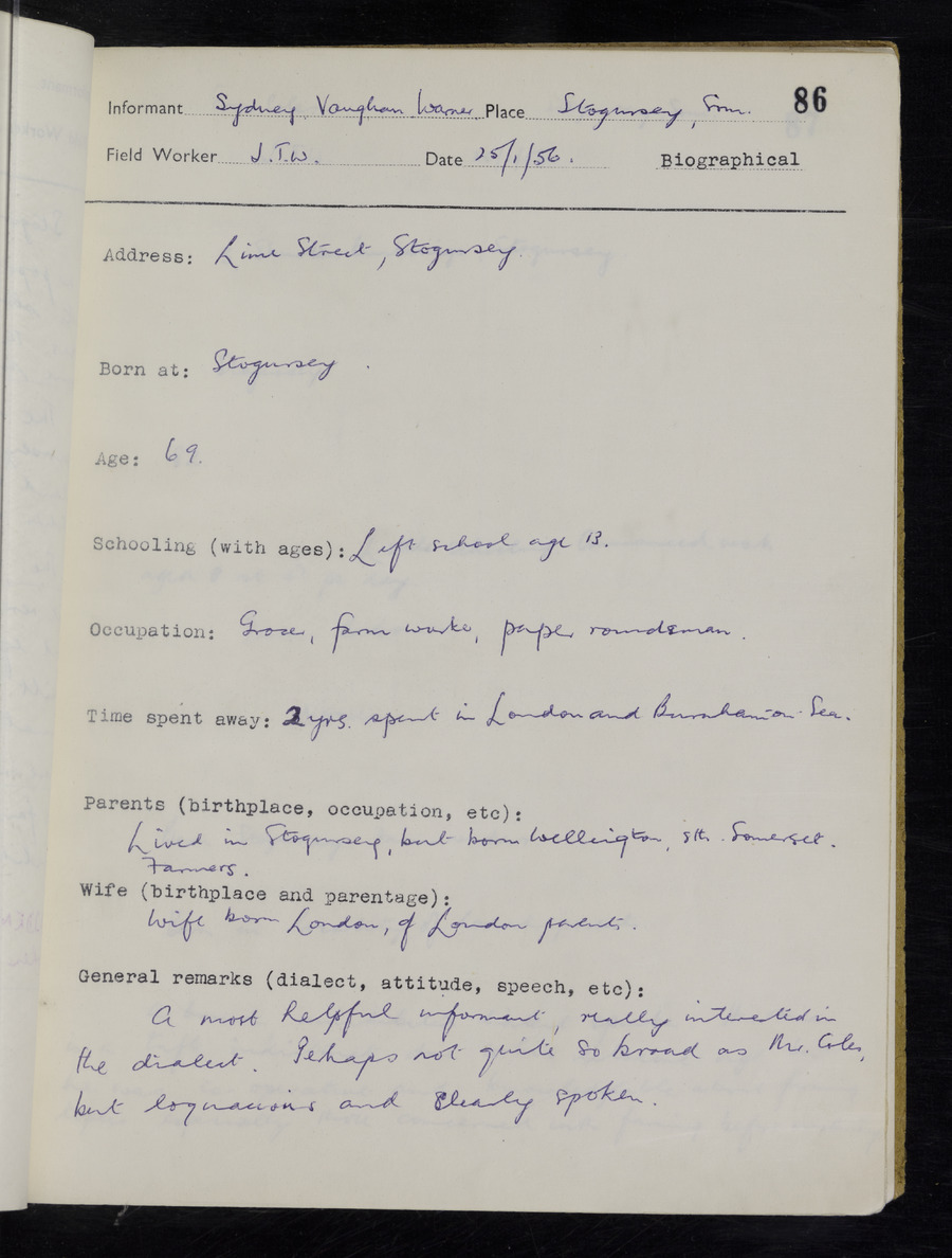 Interviews have been carried out by fieldworker John Wright. There are two informants for this response book - Tom Coles and Sydney Vaughan Warner. Their responses can be found in the following books: Tom Coles - I, II, III Sydney Warner - IV, V, VI, VII, VIII, IX