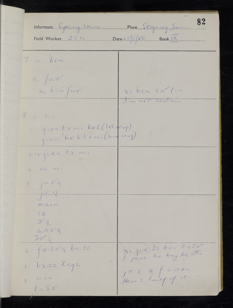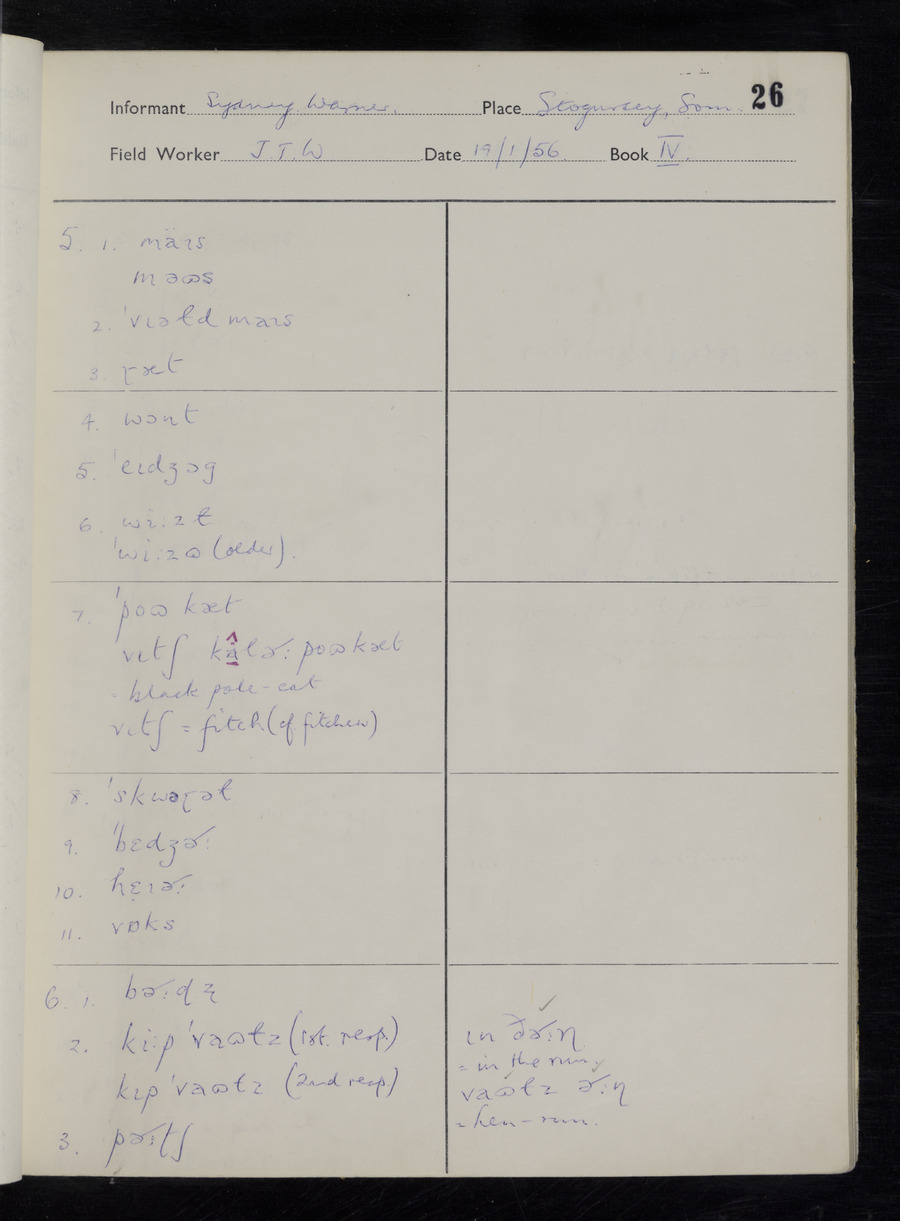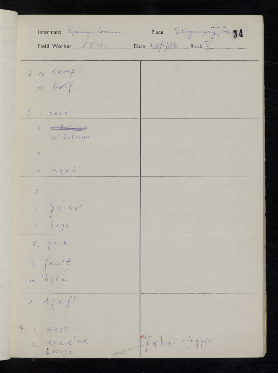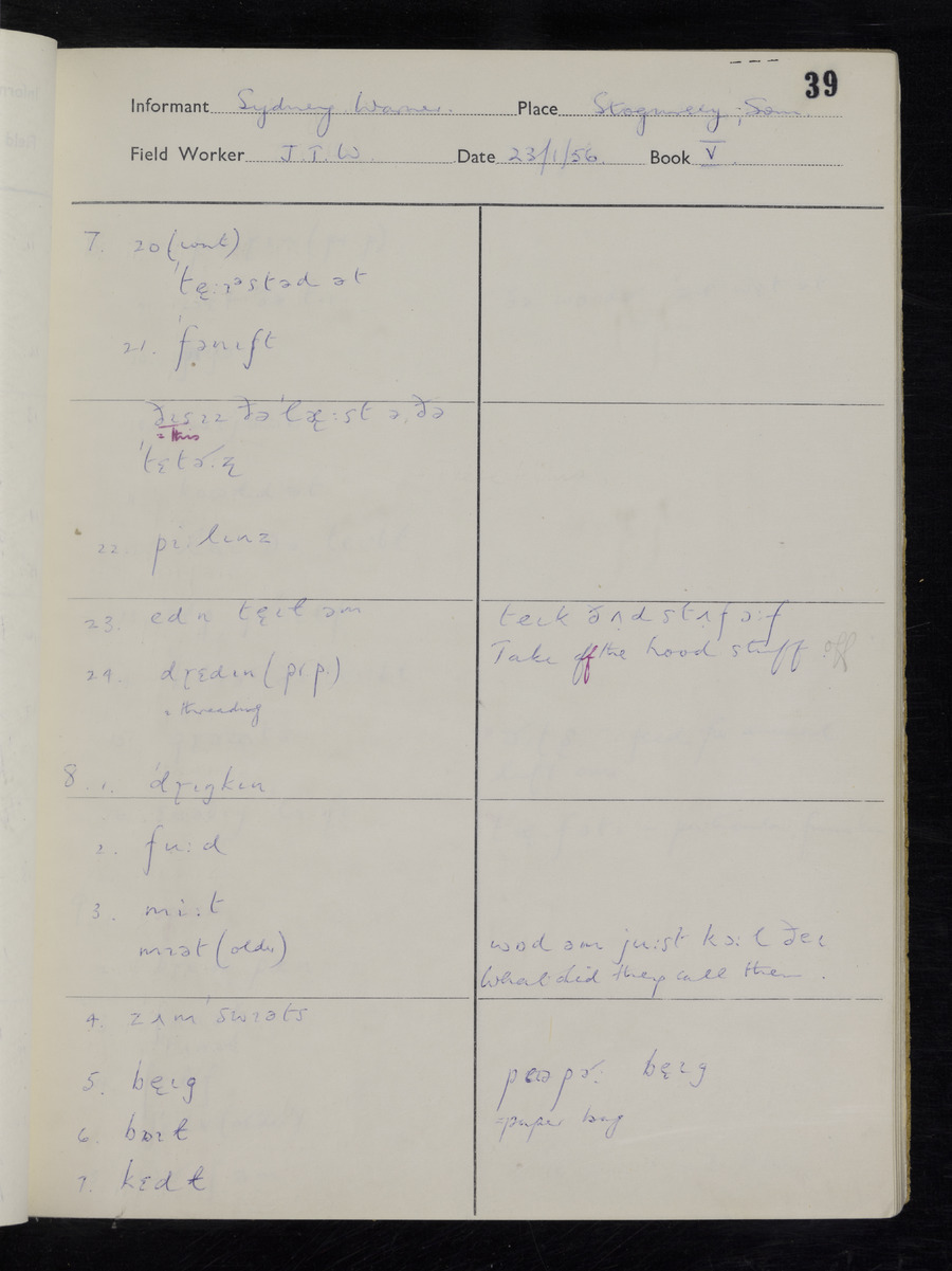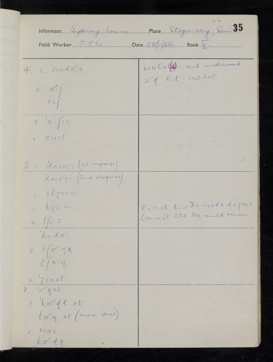 Interviews have been carried out by fieldworker John Wright. There are two informants for this response book - Tom Coles and Sydney Vaughan Warner. Their responses can be found in the following books: Tom Coles - I, II, III Sydney Warner - IV, V, VI, VII, VIII, IX