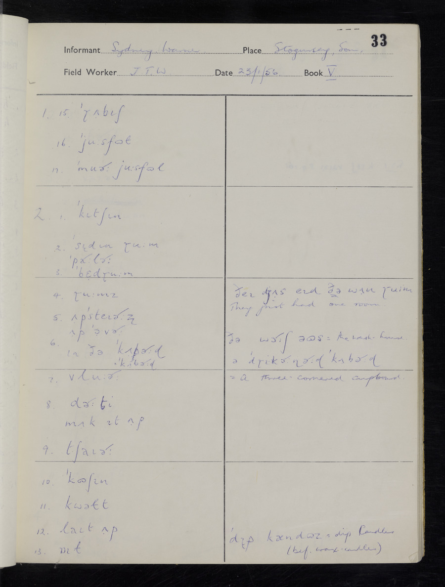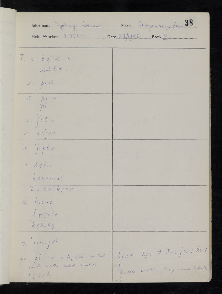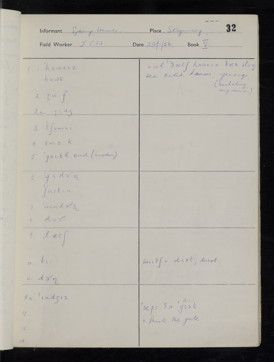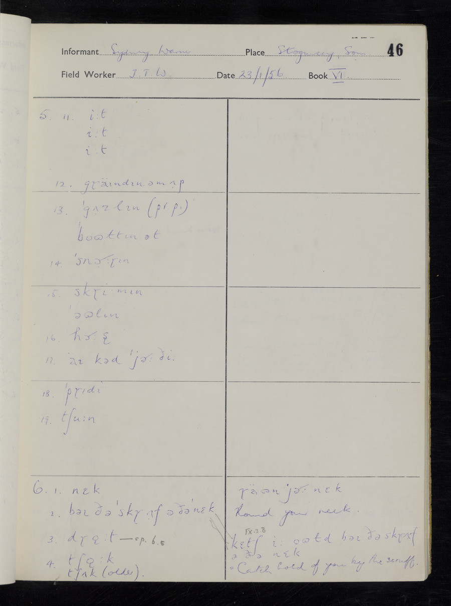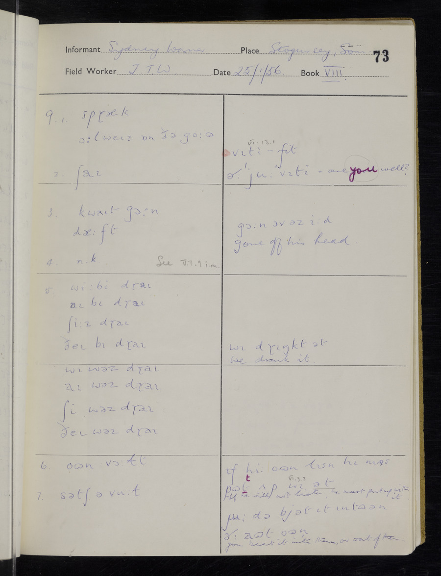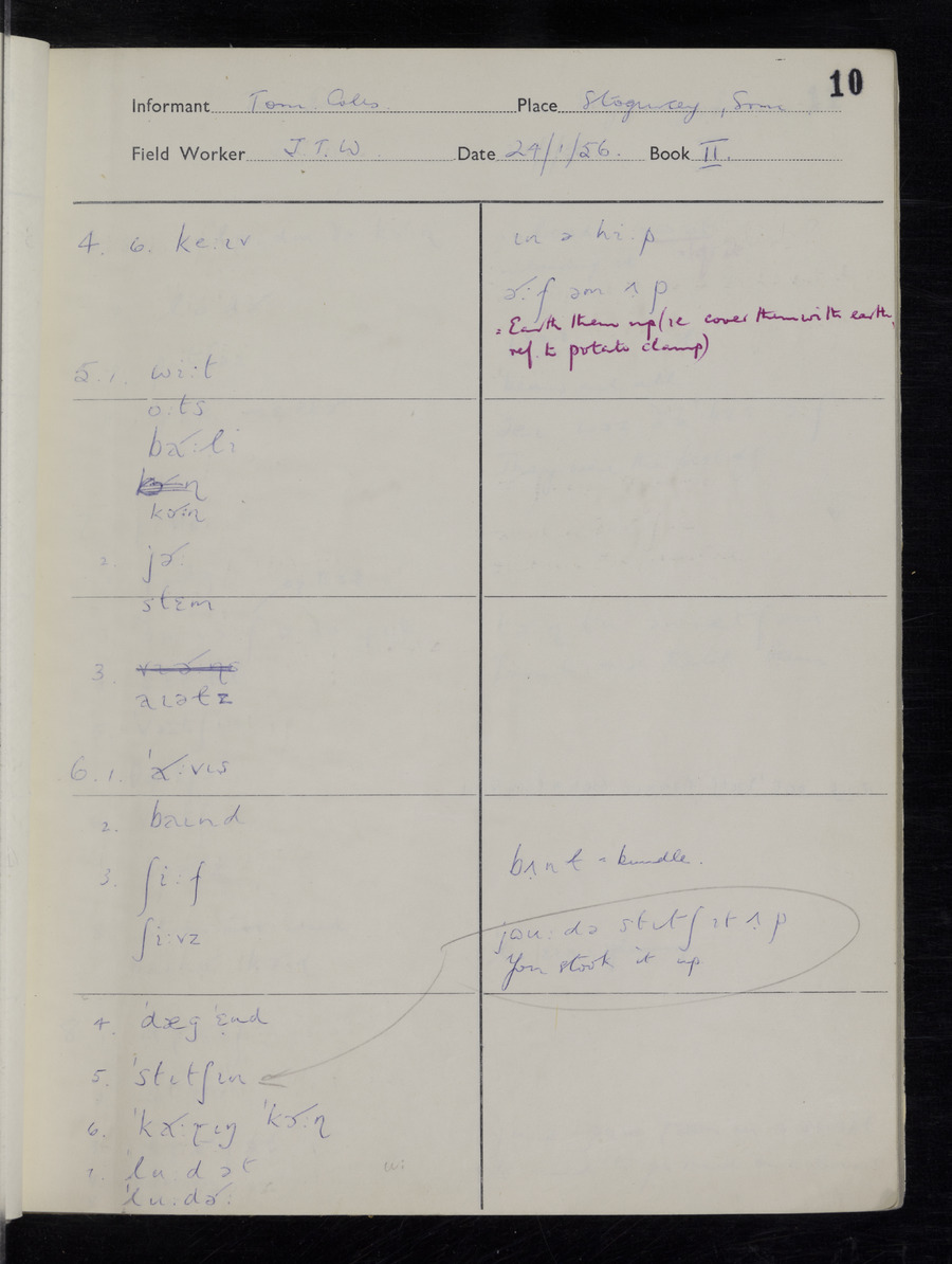 Interviews have been carried out by fieldworker John Wright. There are two informants for this response book - Tom Coles and Sydney Vaughan Warner. Their responses can be found in the following books: Tom Coles - I, II, III Sydney Warner - IV, V, VI, VII, VIII, IX