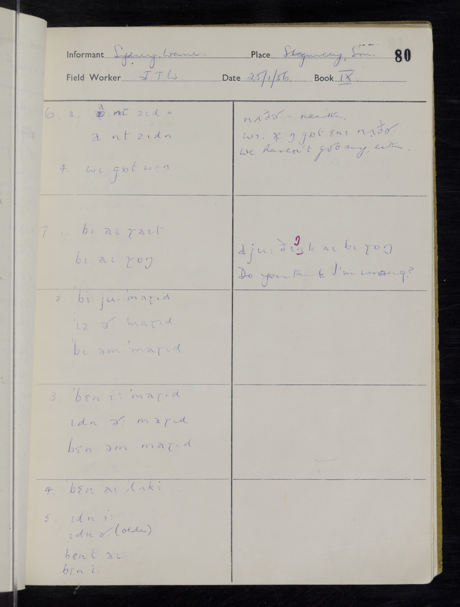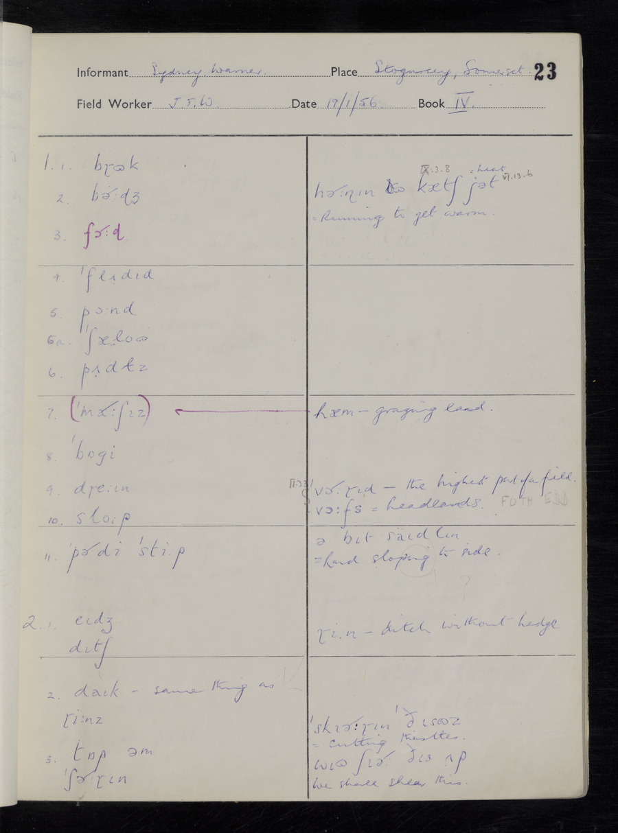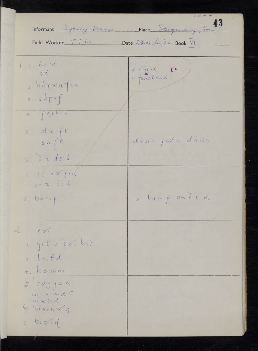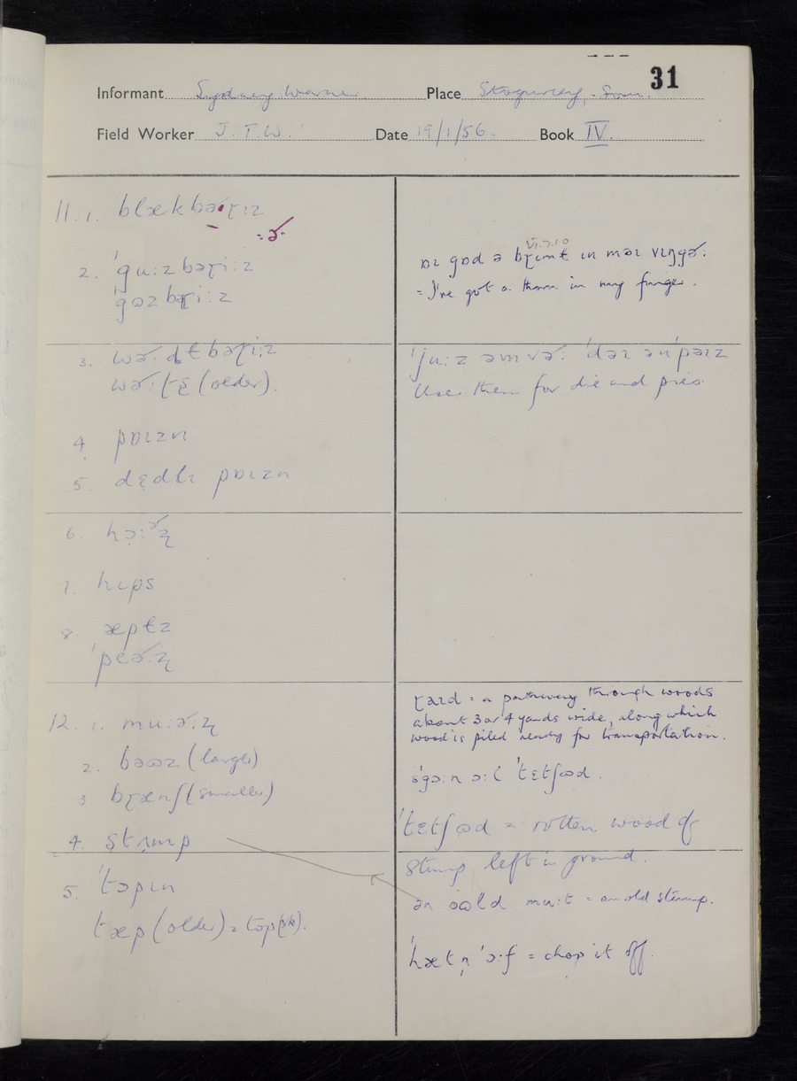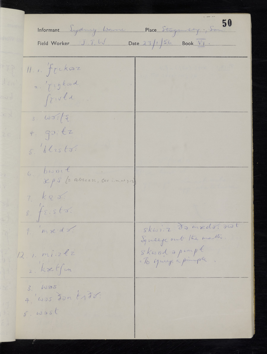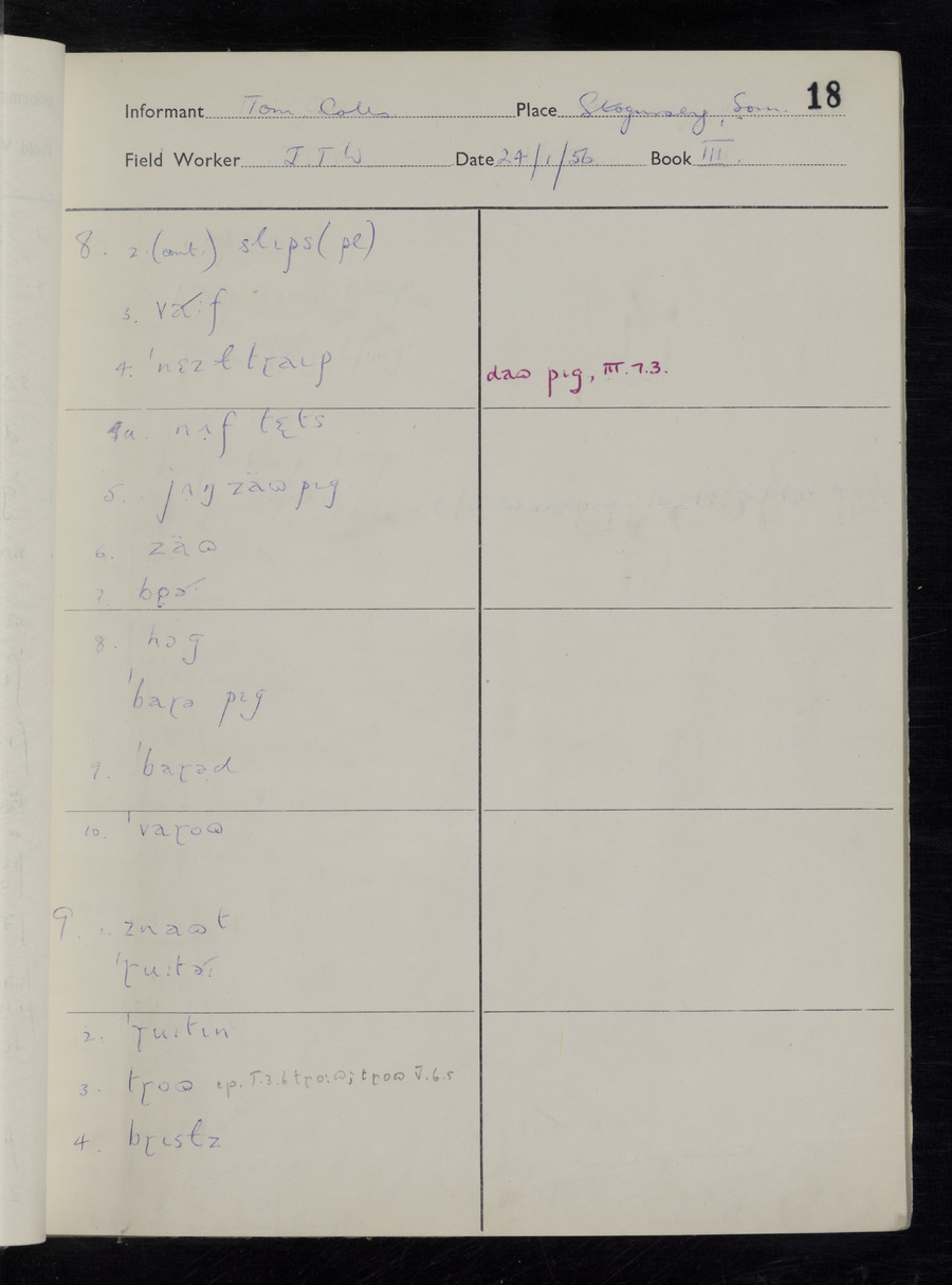 Interviews have been carried out by fieldworker John Wright. There are two informants for this response book - Tom Coles and Sydney Vaughan Warner. Their responses can be found in the following books: Tom Coles - I, II, III Sydney Warner - IV, V, VI, VII, VIII, IX