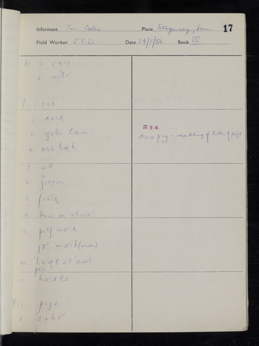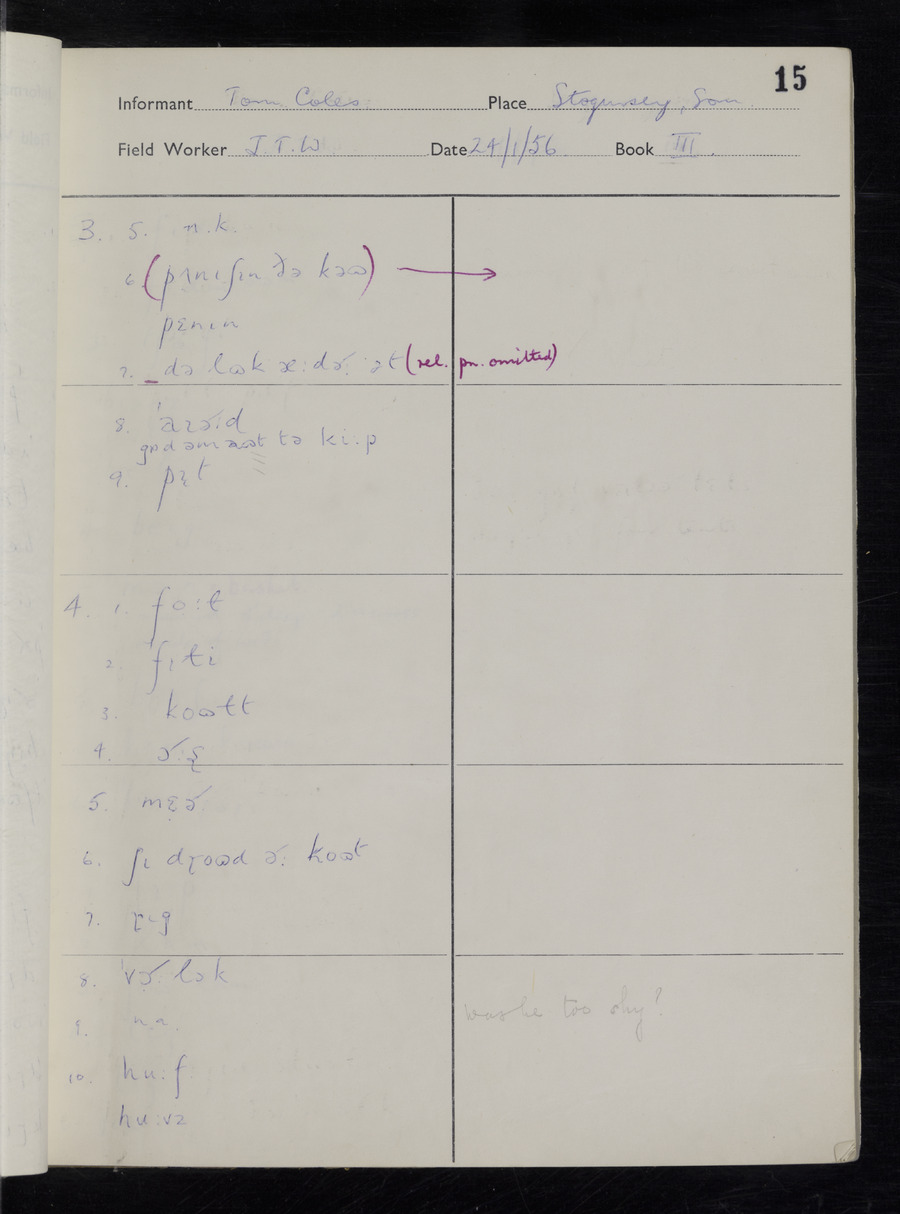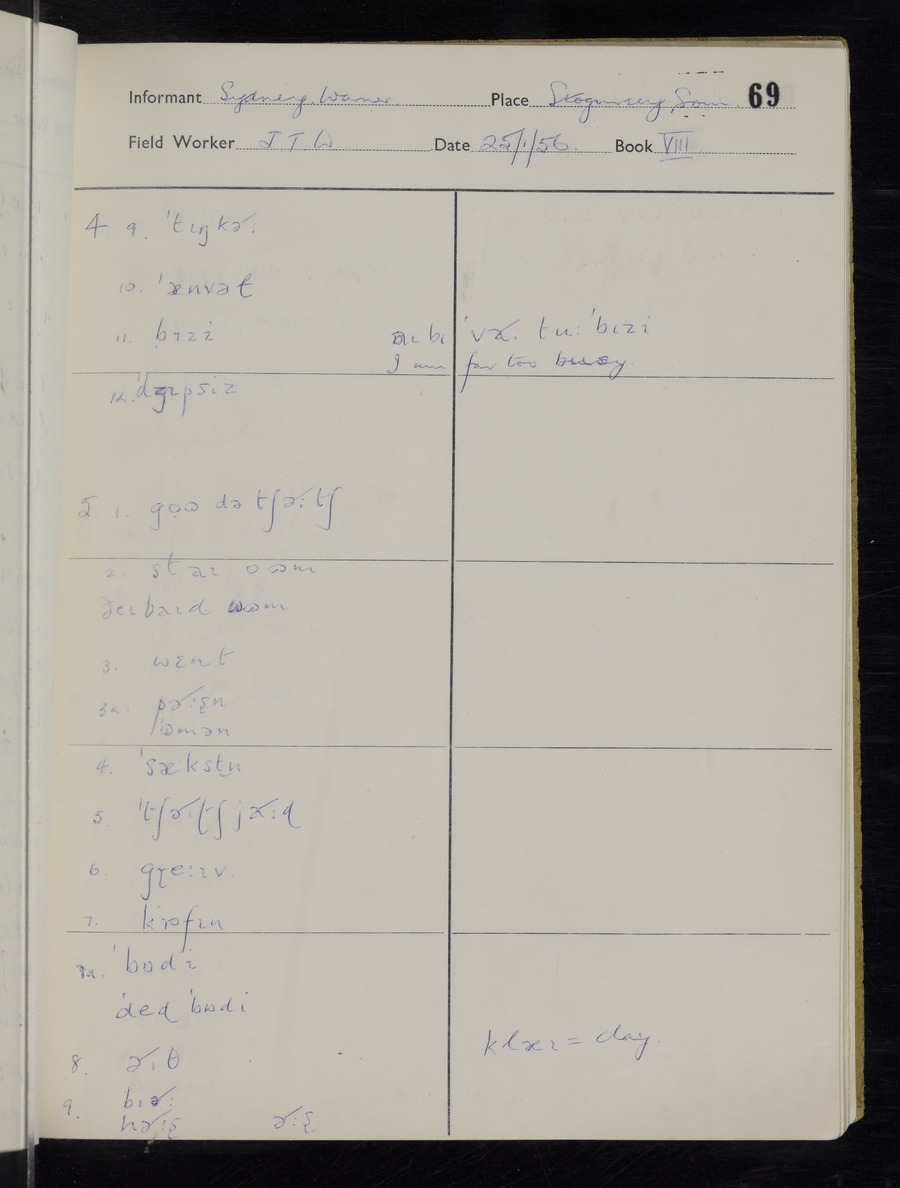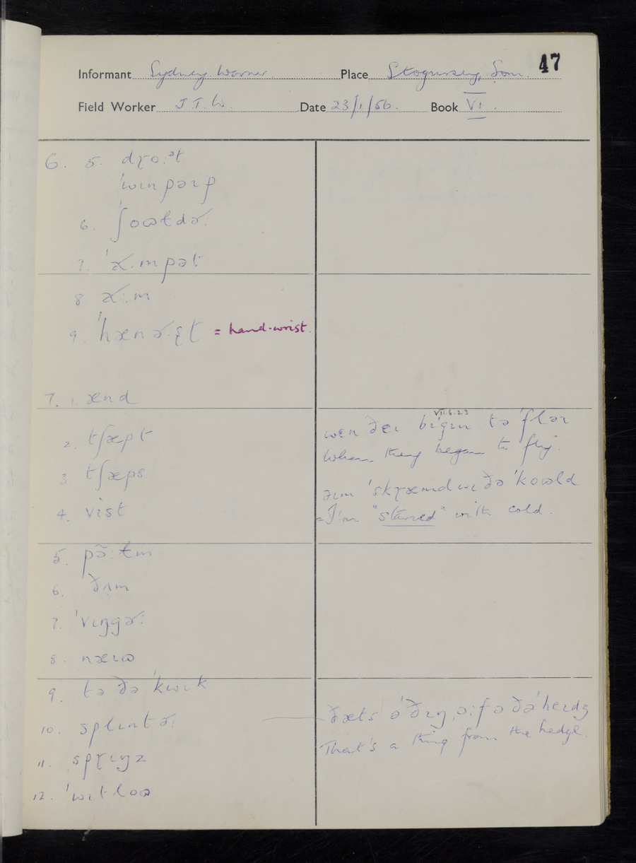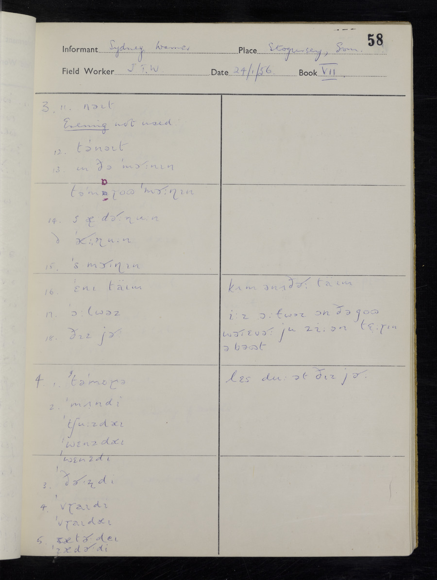 Interviews have been carried out by fieldworker John Wright. There are two informants for this response book - Tom Coles and Sydney Vaughan Warner. Their responses can be found in the following books: Tom Coles - I, II, III Sydney Warner - IV, V, VI, VII, VIII, IX