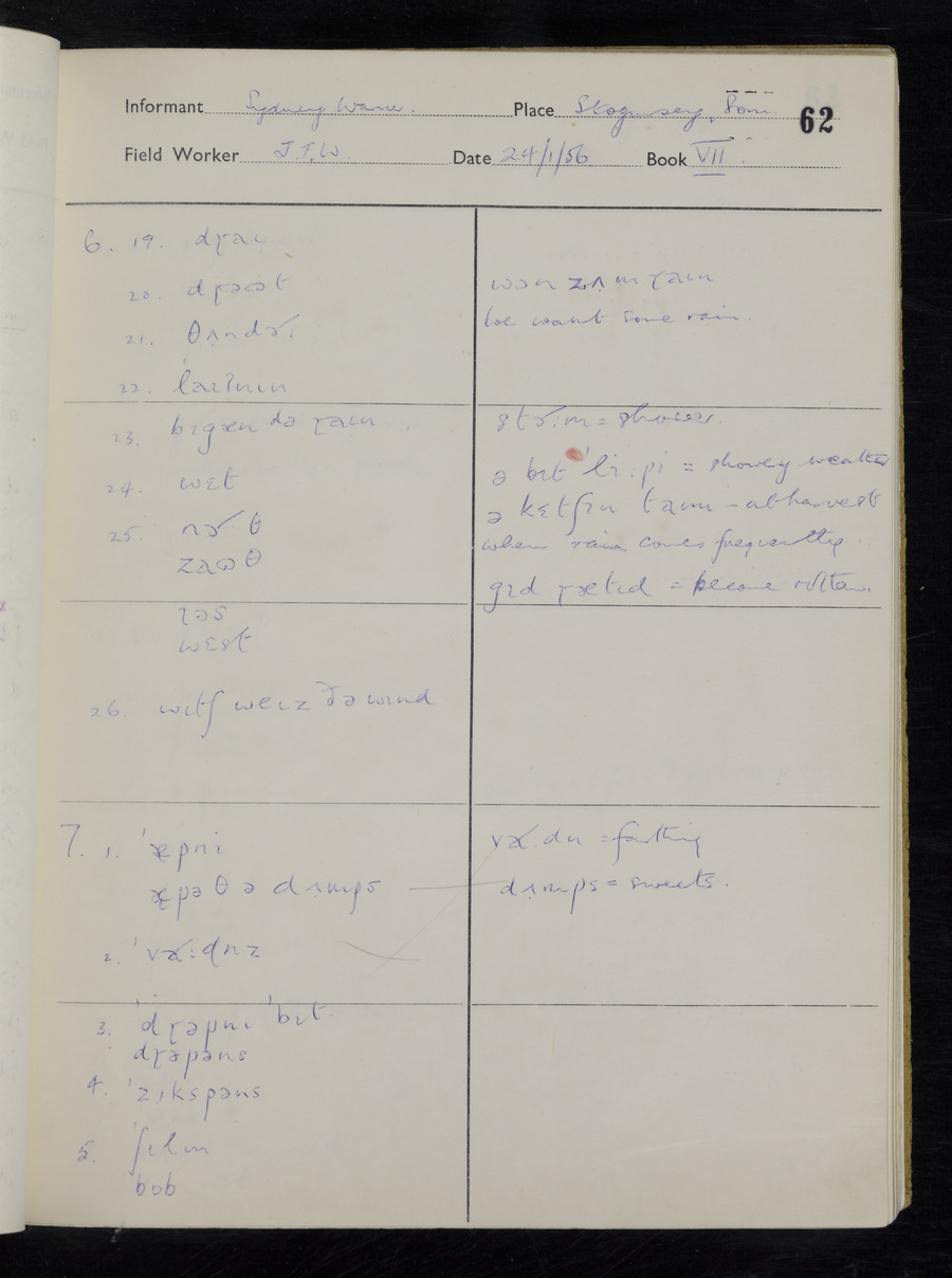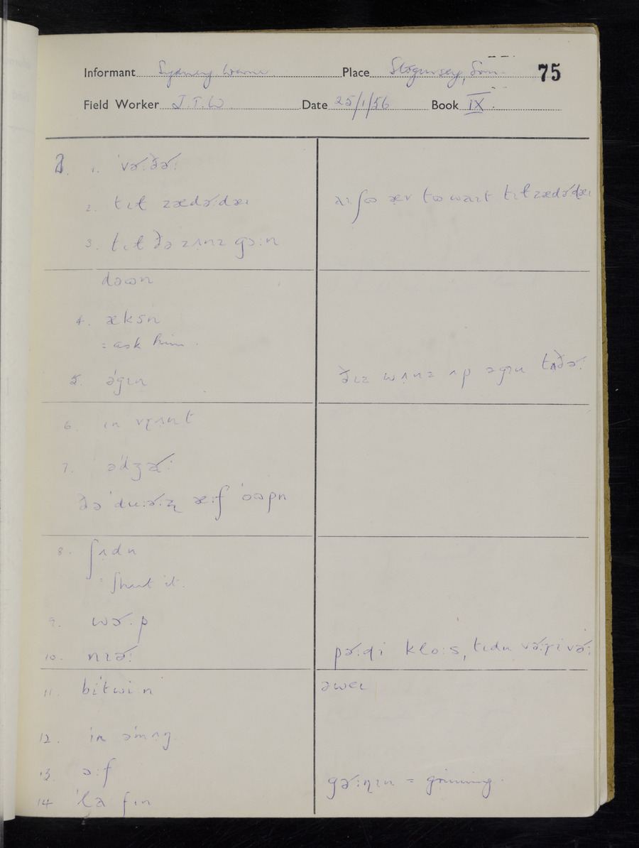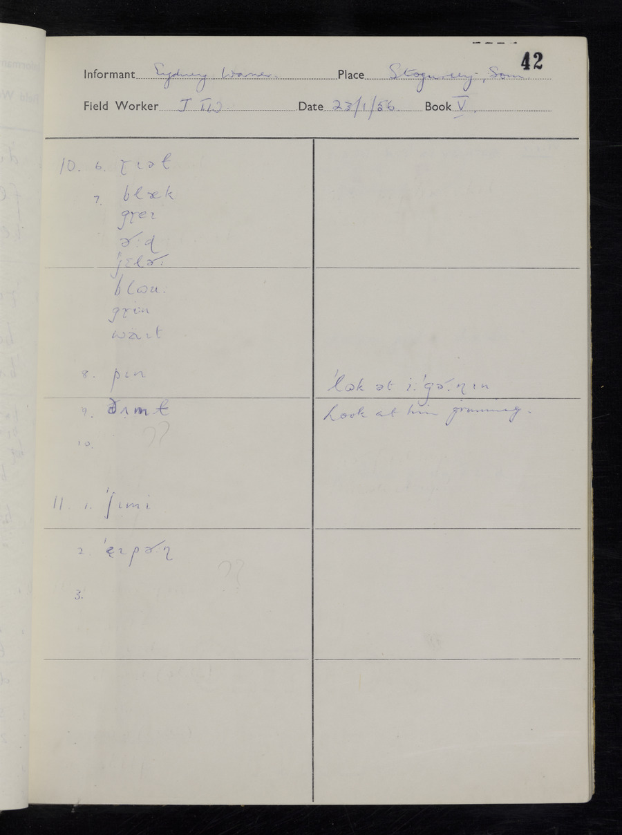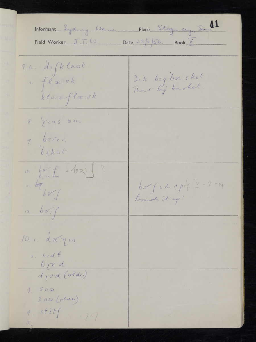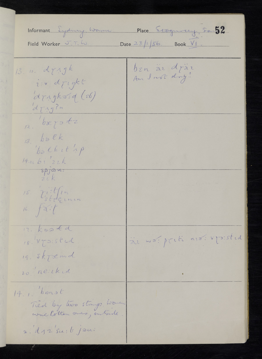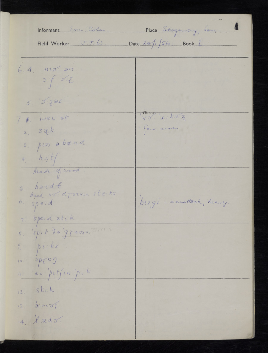 Interviews have been carried out by fieldworker John Wright. There are two informants for this response book - Tom Coles and Sydney Vaughan Warner. Their responses can be found in the following books: Tom Coles - I, II, III Sydney Warner - IV, V, VI, VII, VIII, IX