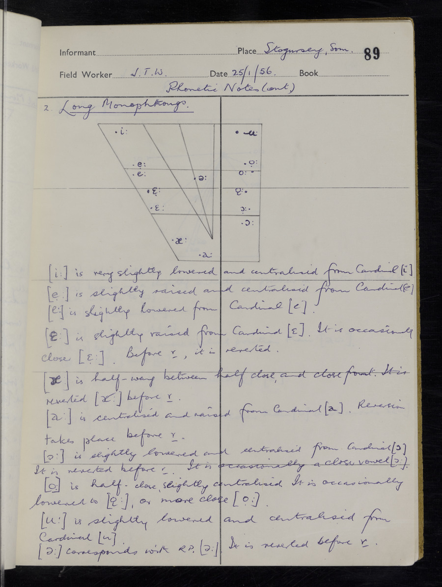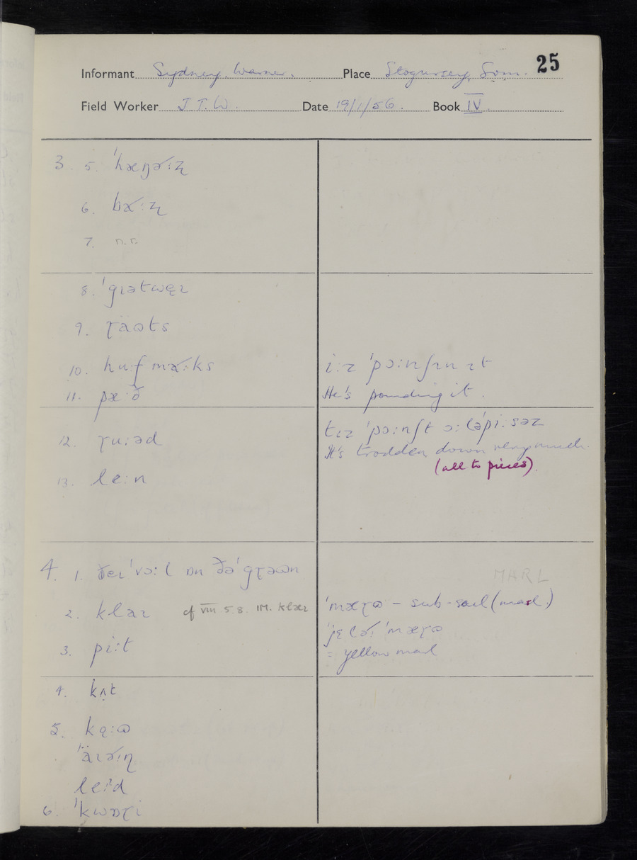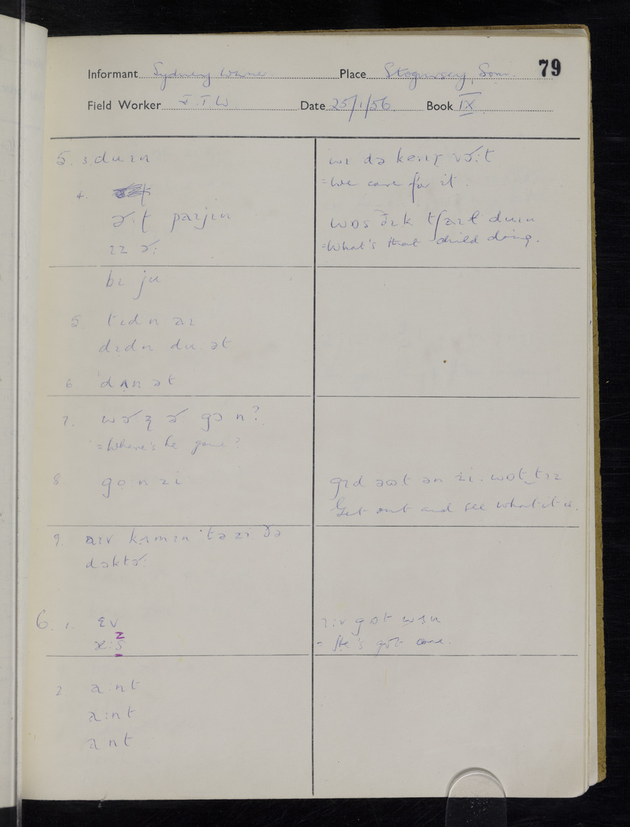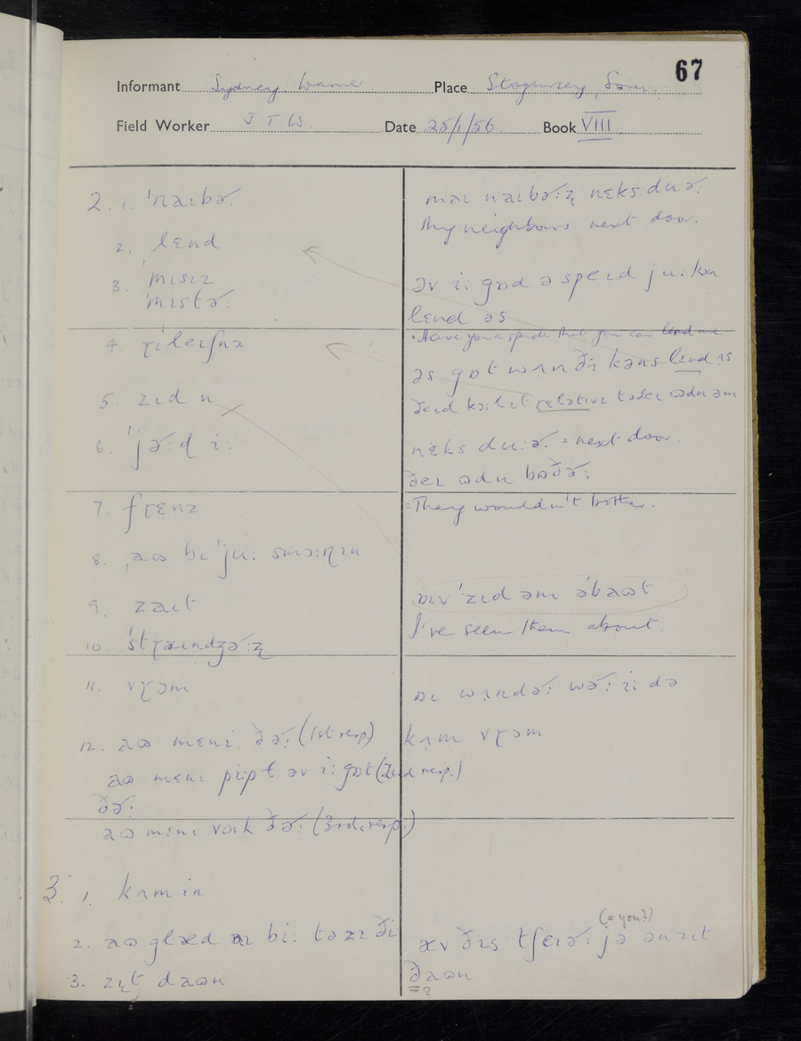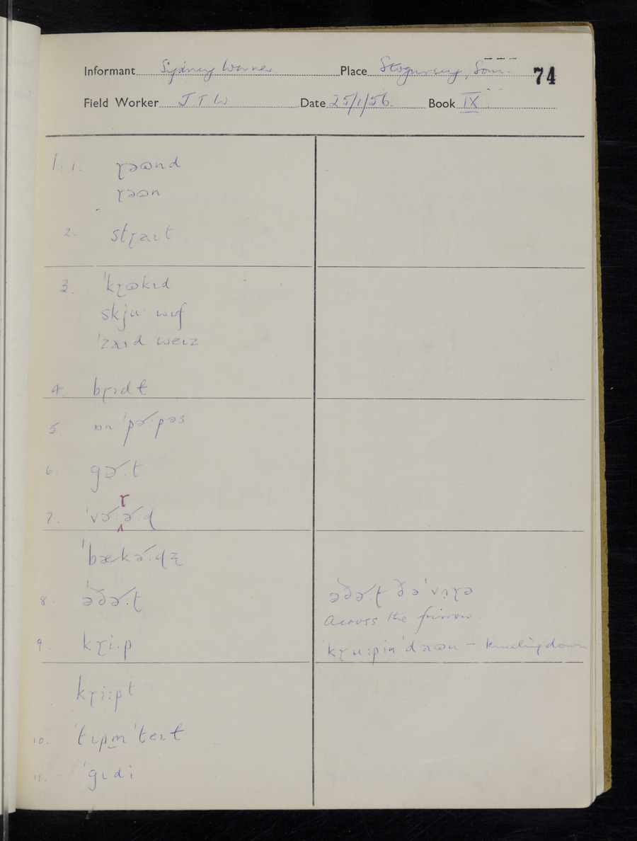 Interviews have been carried out by fieldworker John Wright. There are two informants for this response book - Tom Coles and Sydney Vaughan Warner. Their responses can be found in the following books: Tom Coles - I, II, III Sydney Warner - IV, V, VI, VII, VIII, IX