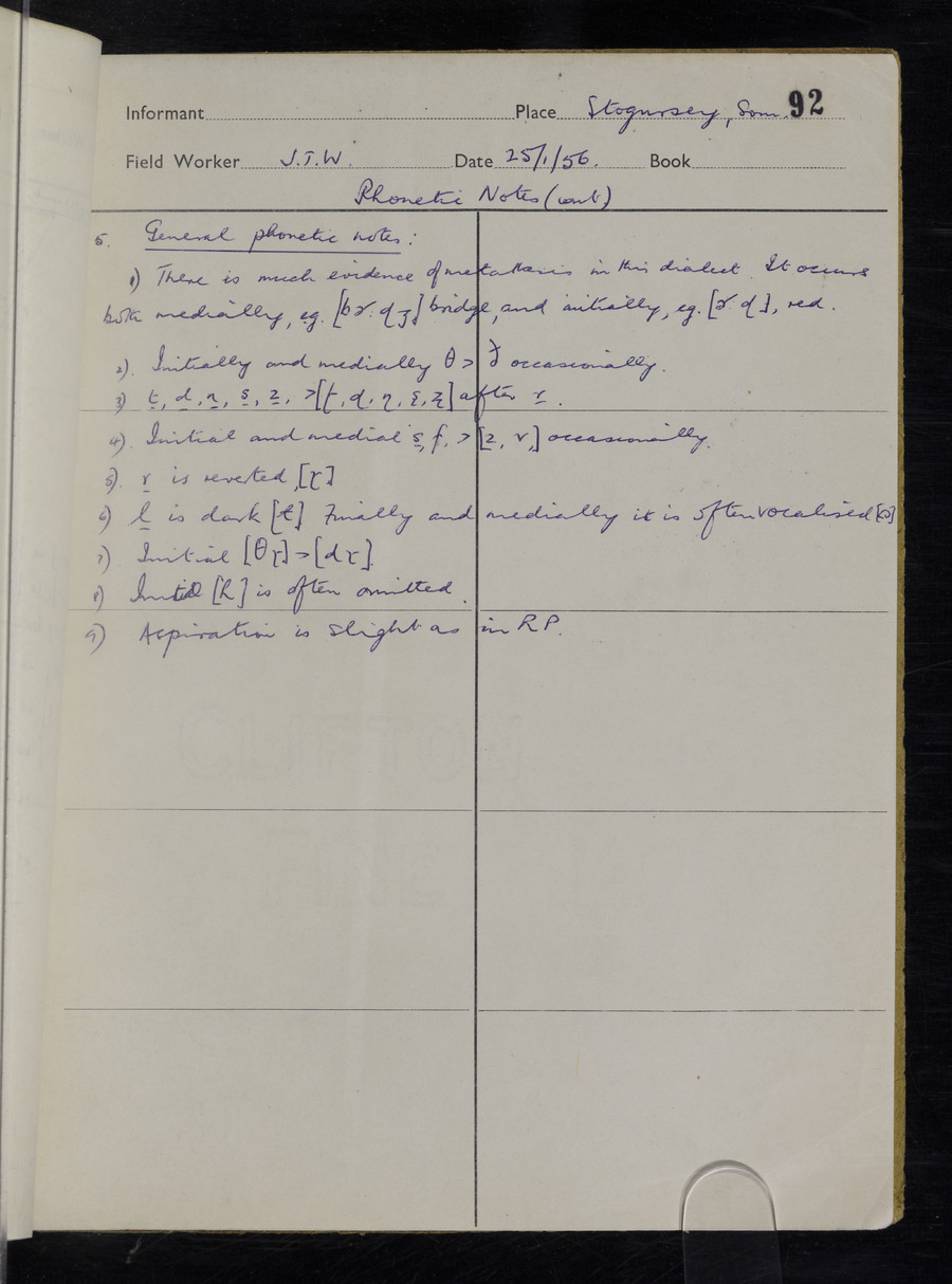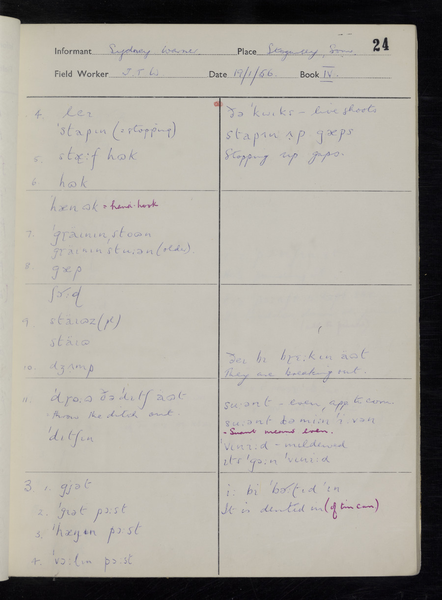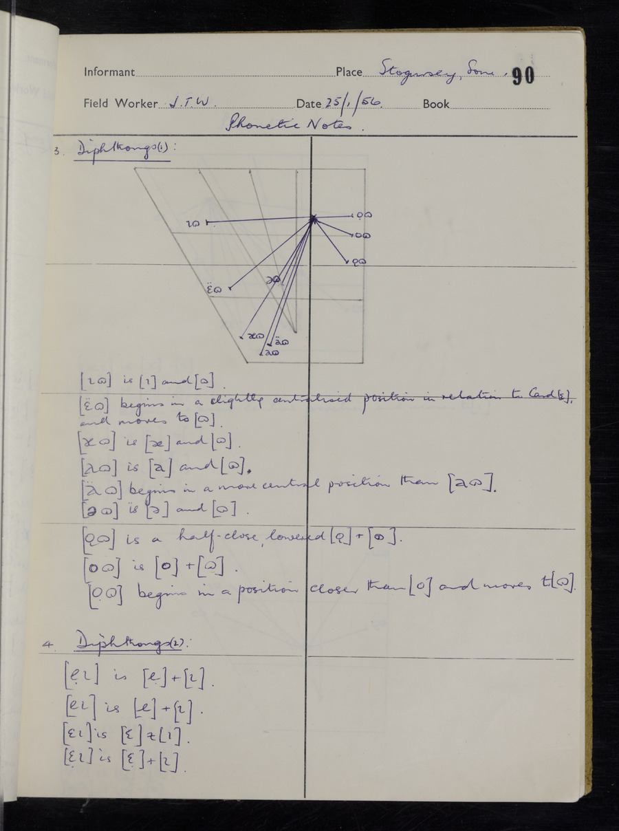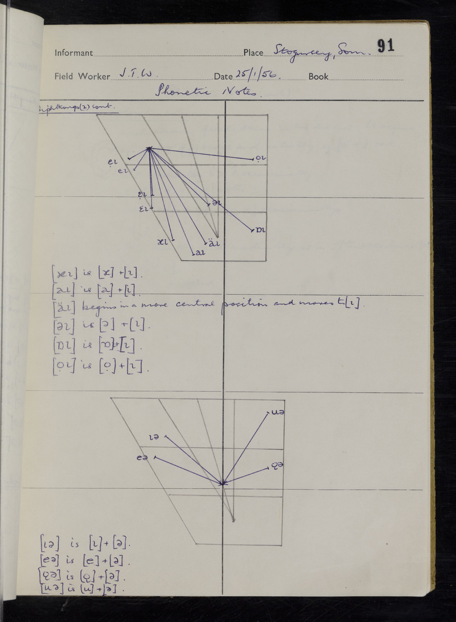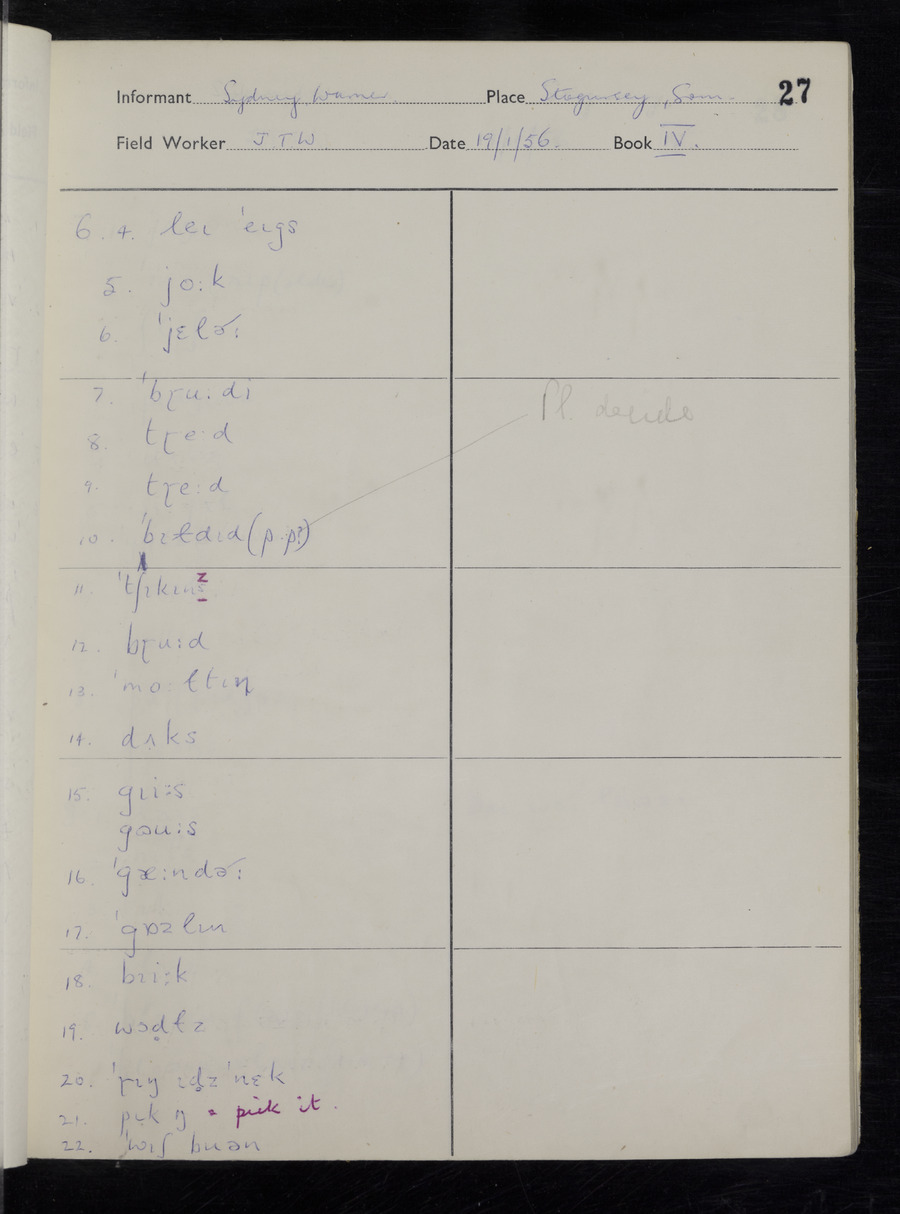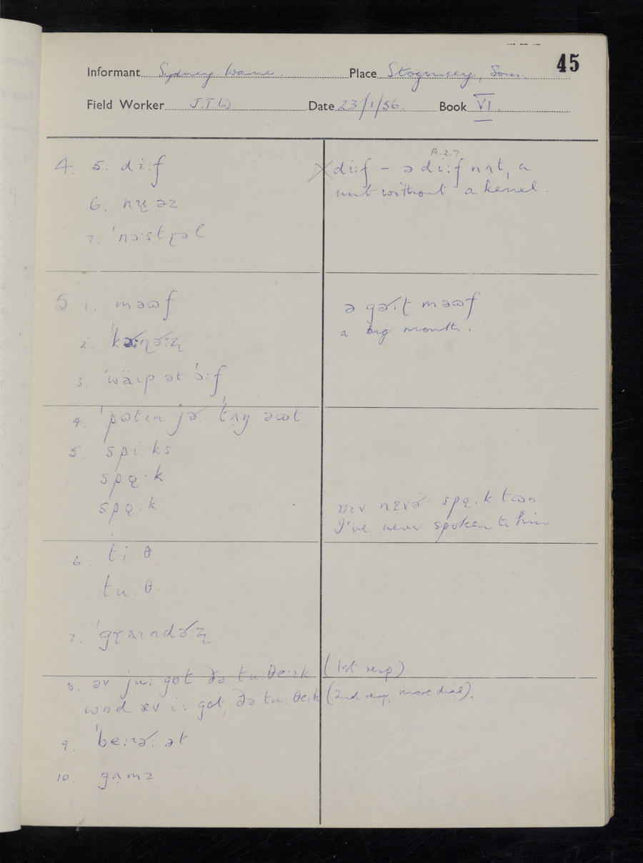 Interviews have been carried out by fieldworker John Wright. There are two informants for this response book - Tom Coles and Sydney Vaughan Warner. Their responses can be found in the following books: Tom Coles - I, II, III Sydney Warner - IV, V, VI, VII, VIII, IX