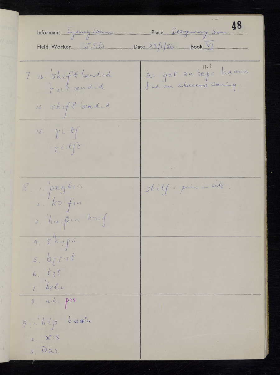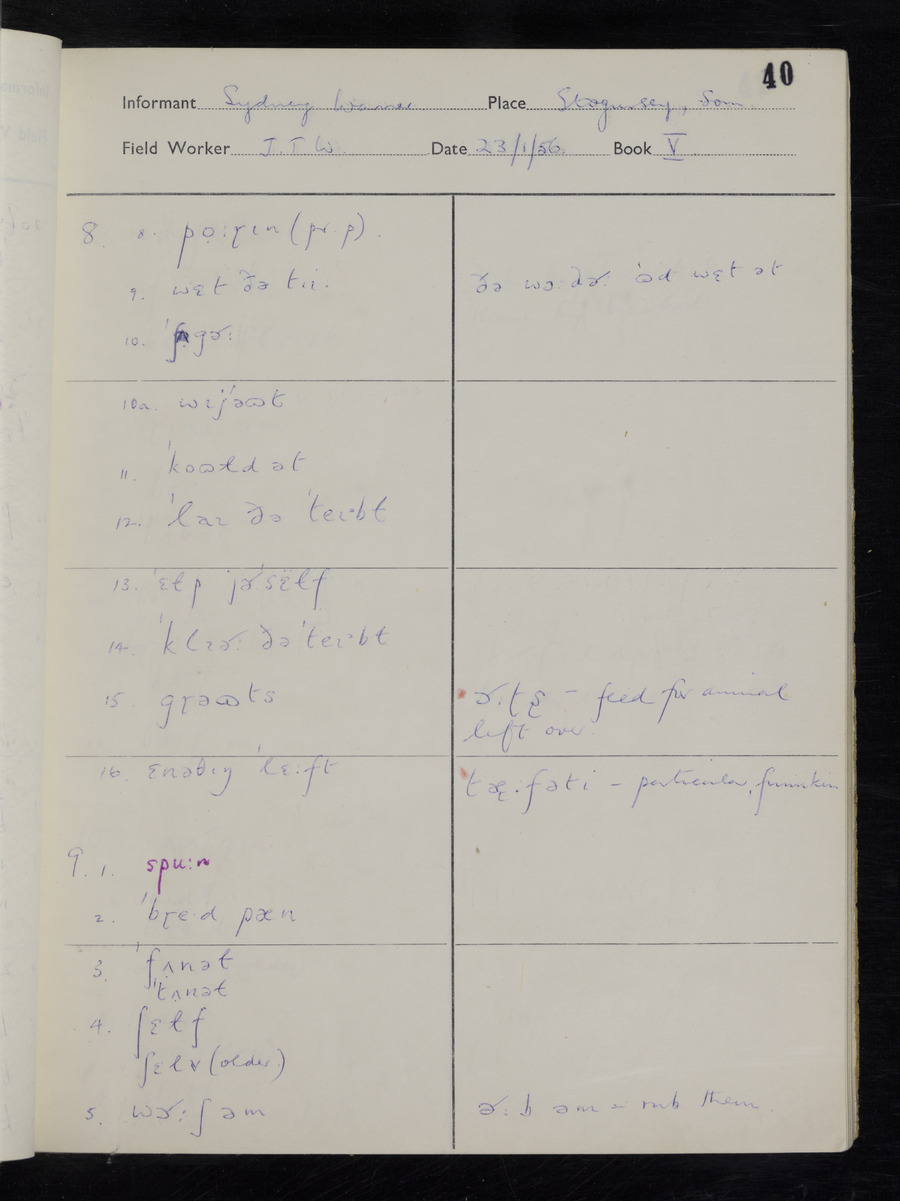 Response book recording the answers given by informants during the Survey of English Dialect. It includes 9 sections that cover a range of topics relating to work, domestic and social life. Answers are recorded in the International Phonetic Alphabet.