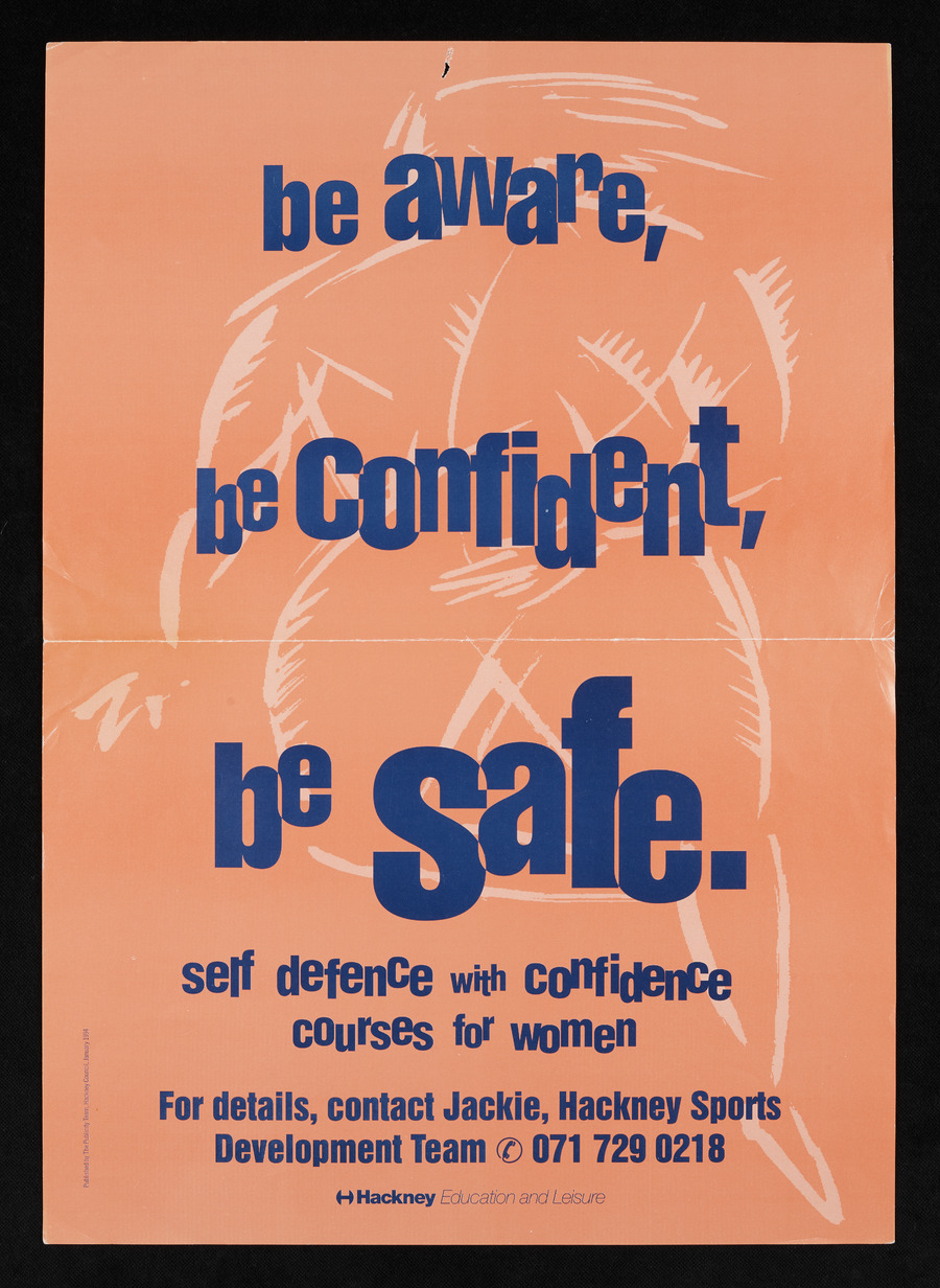 Orange A3 portrait poster with blue text, advertising self defence courses in Hackney, London. Main poster text reads 'Be aware, be confident, be safe. Self defence with confidence. Courses for women'. Distributed by Hackney Council, January 1994.