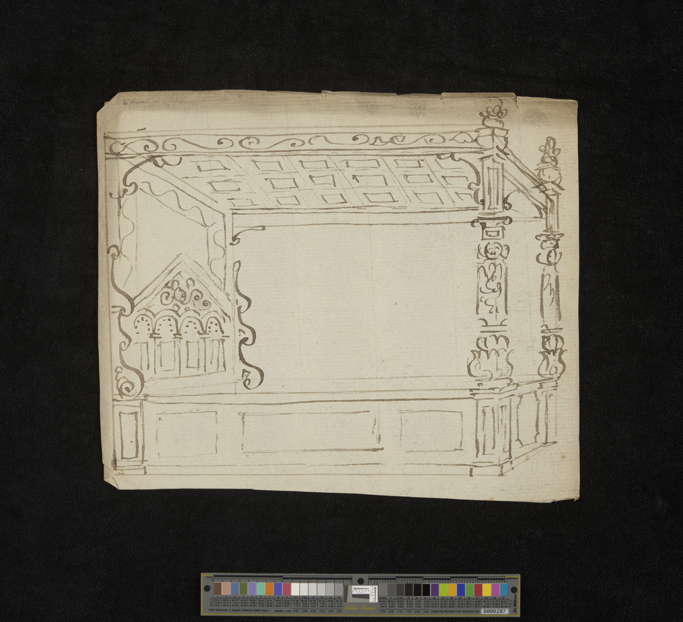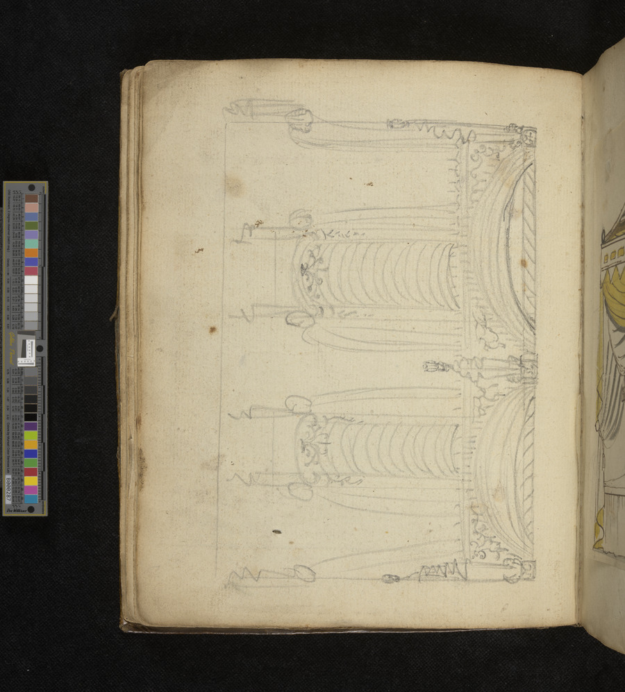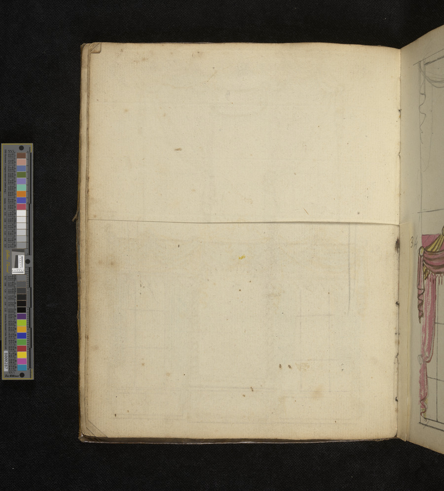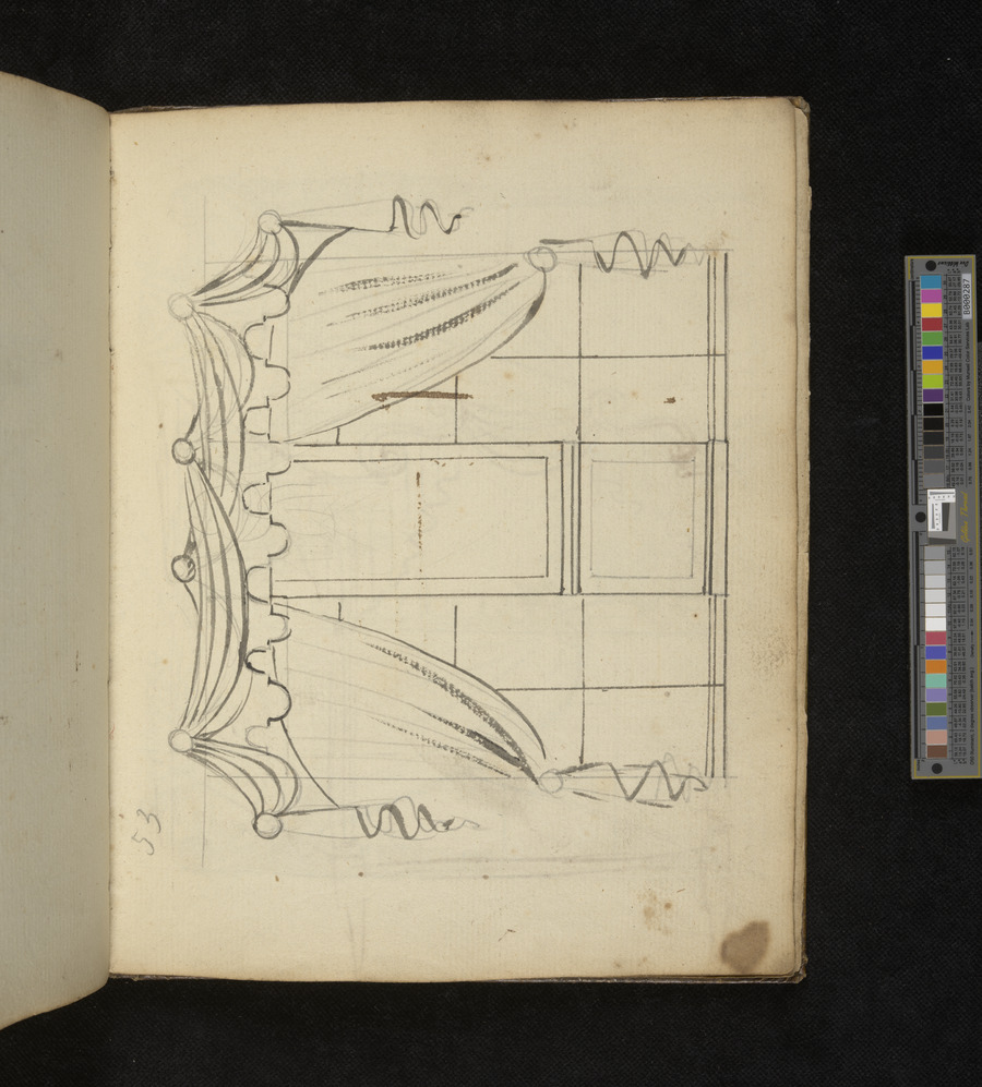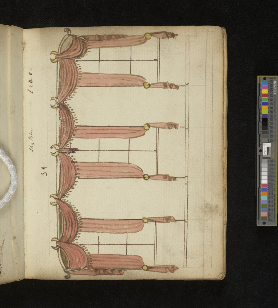 Working Pattern book of Daniel Thorn of Bear Yard, Clare Market, Westminster. contains approximatley 130 original hand drawn designs. includes designs for drapery, curtains and furniture. some designs are coloured with watercolour, others in pen and ink.