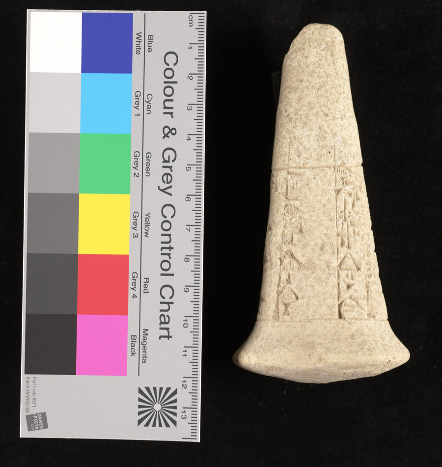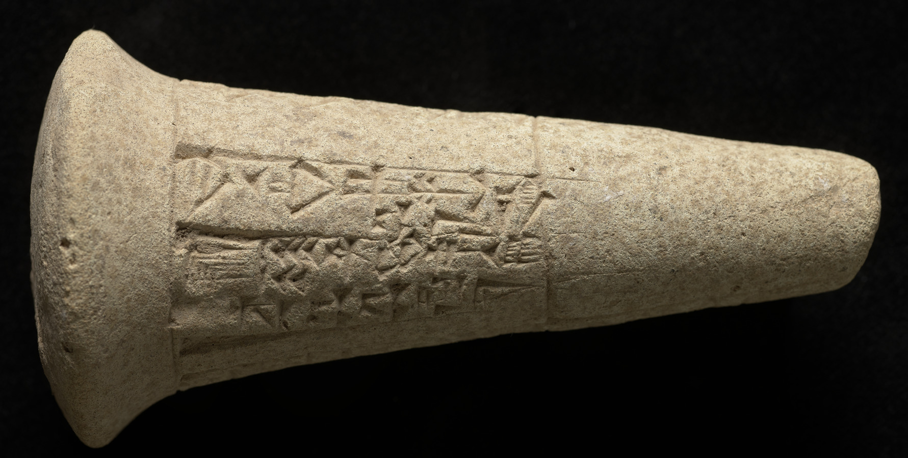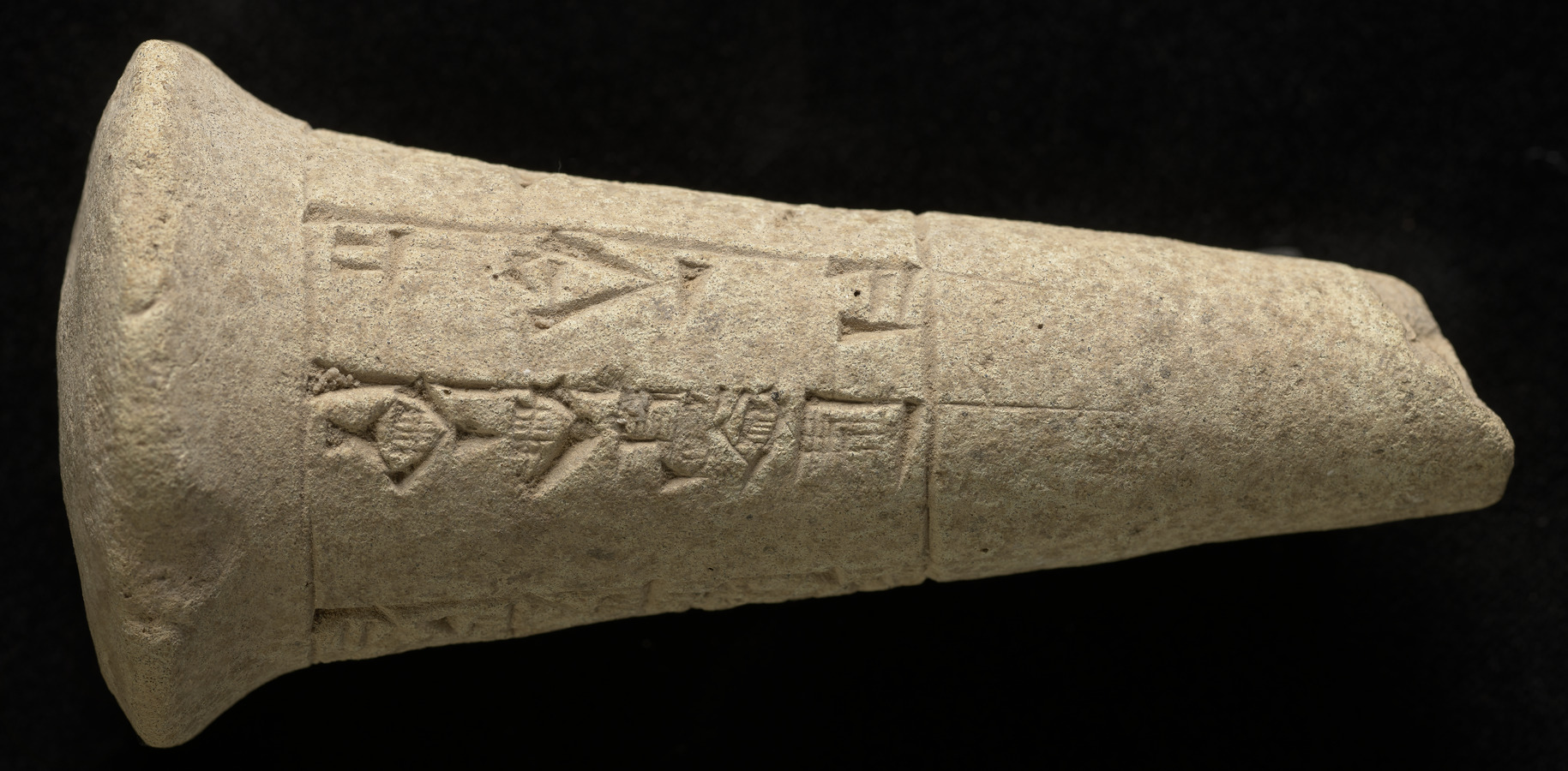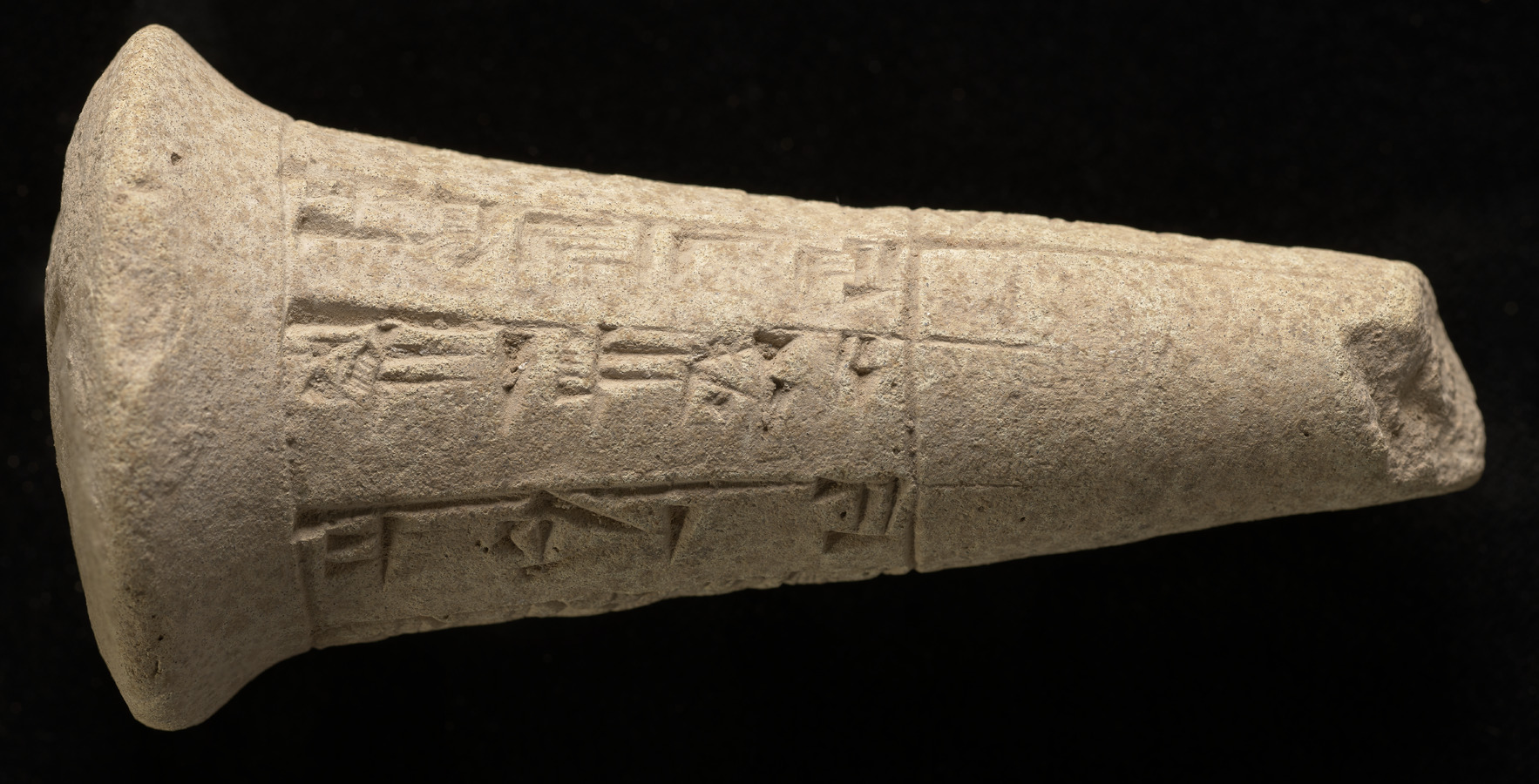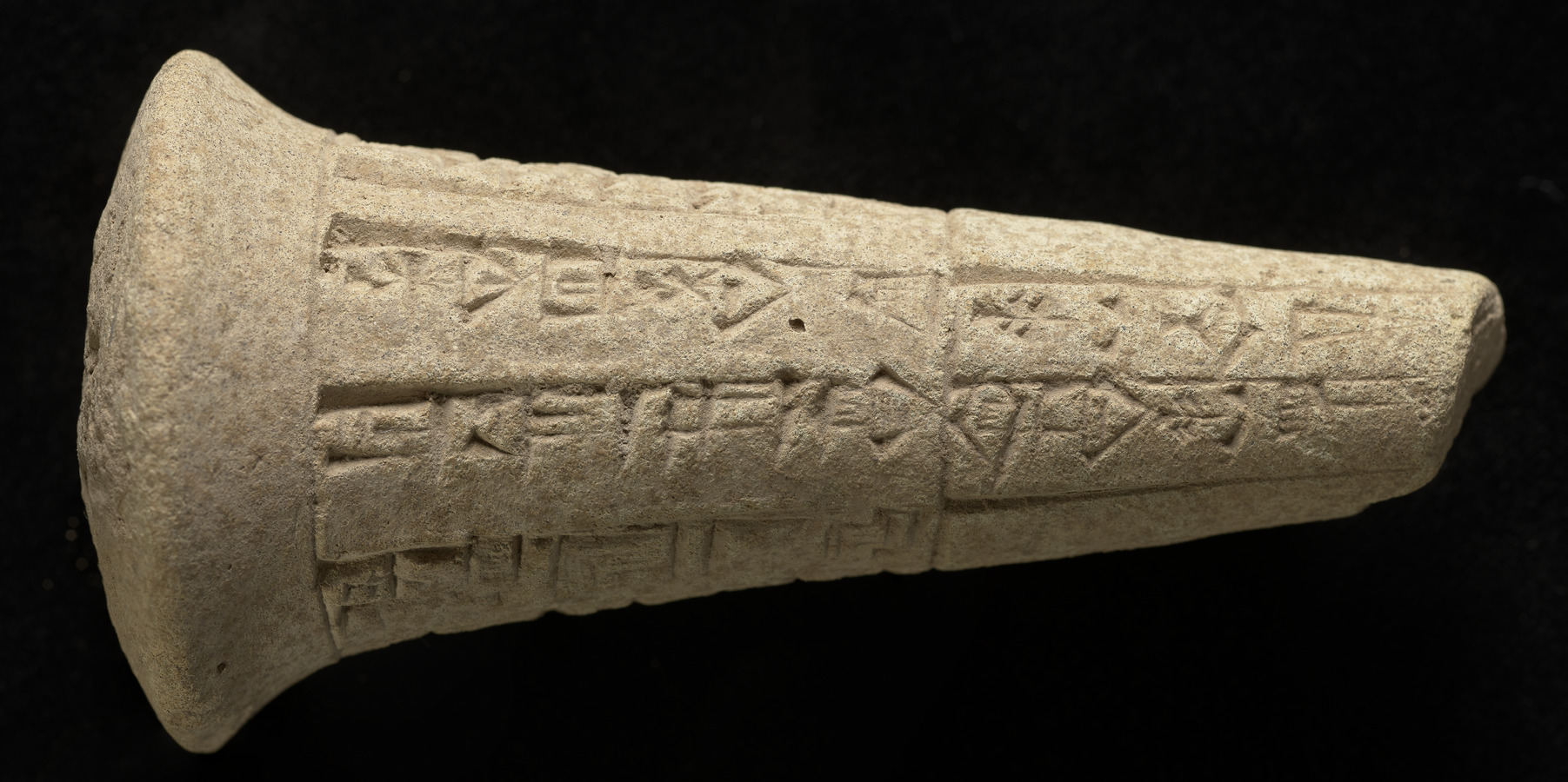 Described as a 'Sumerian foundation cone of Gudea, from Tello (ancient Girsu)'. This cone shaped stone has a domed base and is broken at the point.