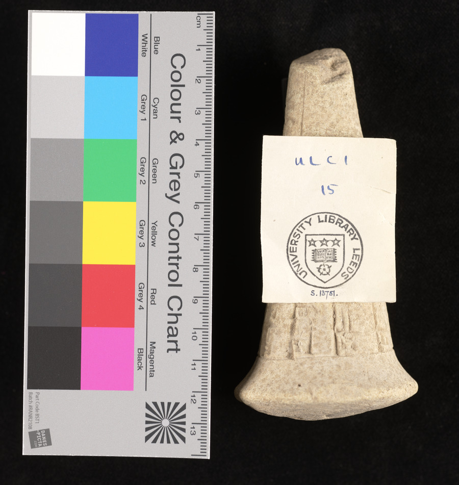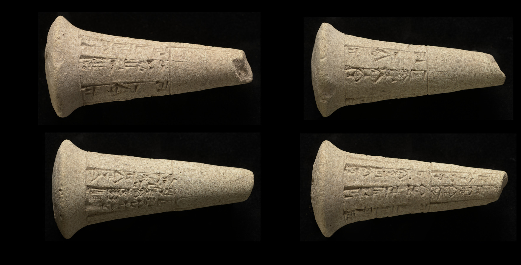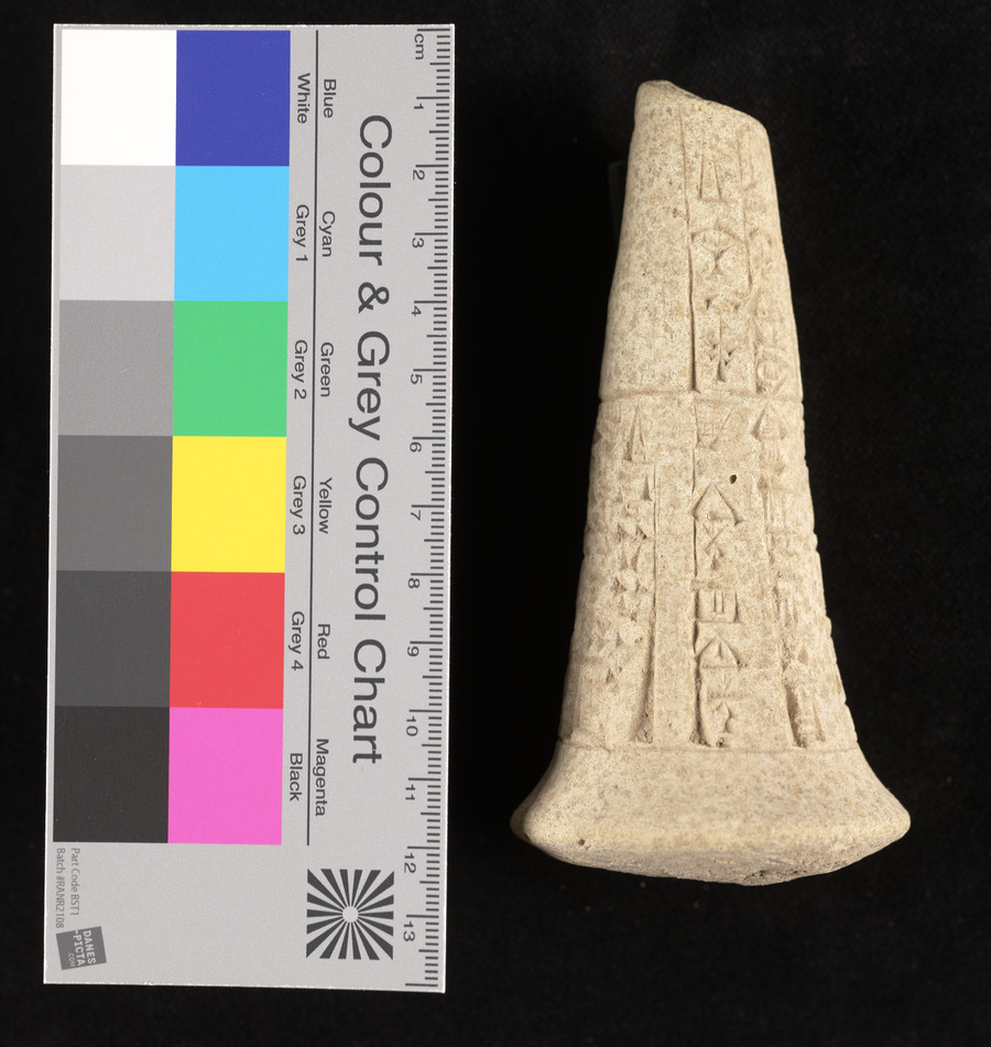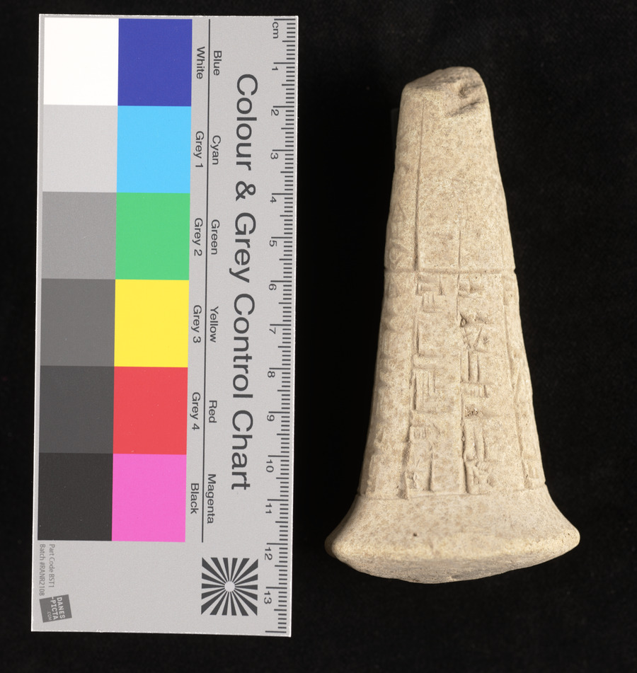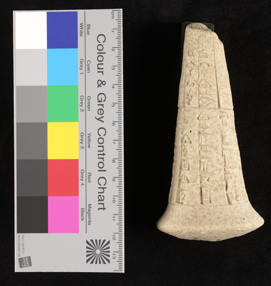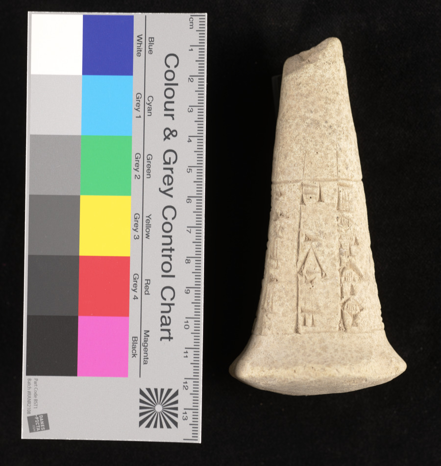 Described as a 'Sumerian foundation cone of Gudea, from Tello (ancient Girsu)'. This cone shaped stone has a domed base and is broken at the point.