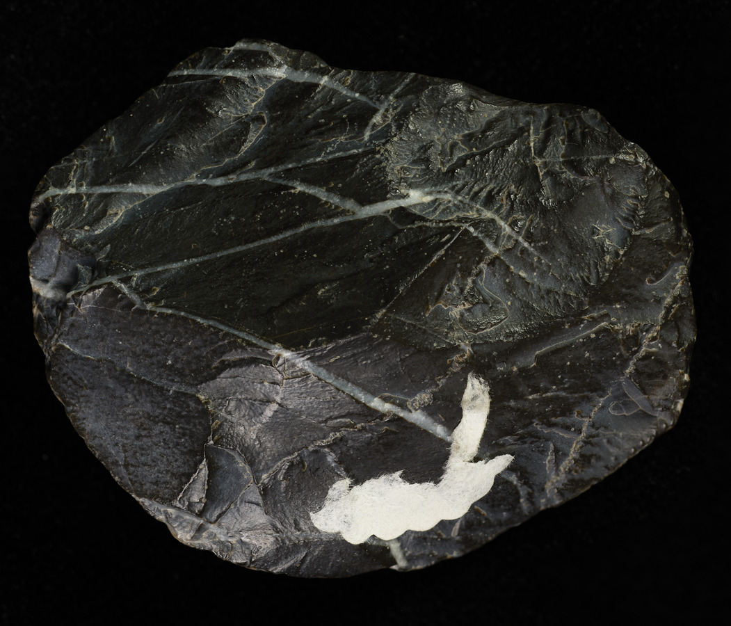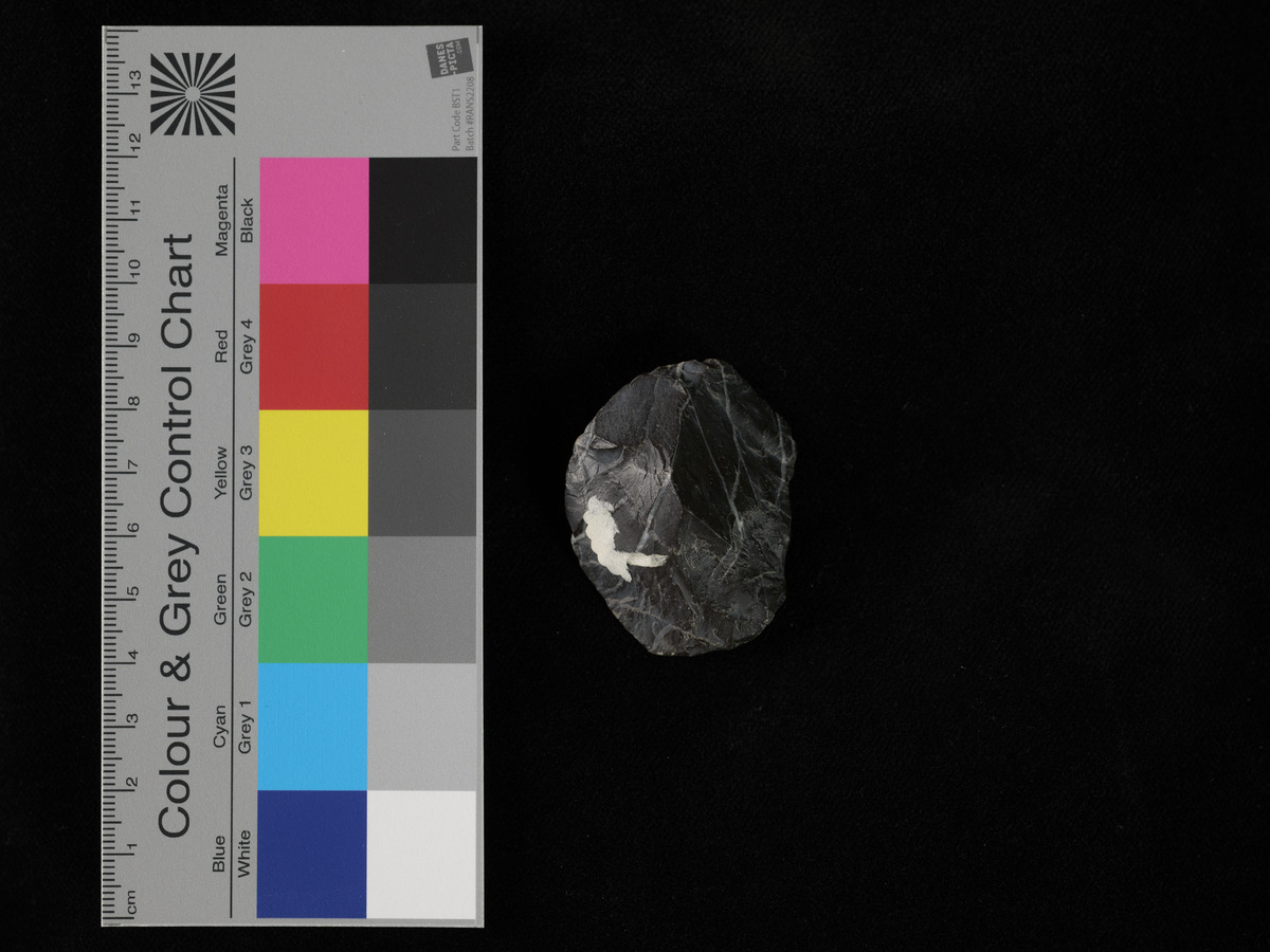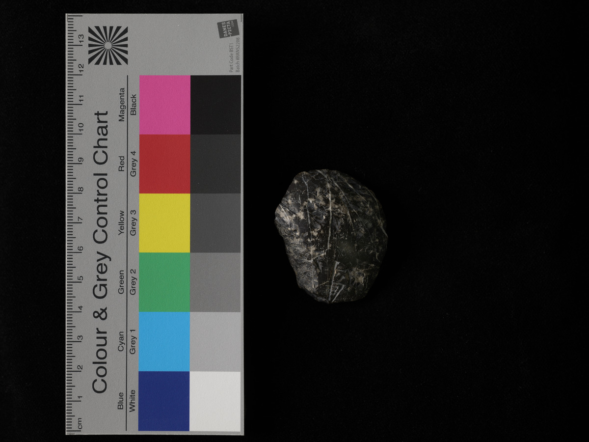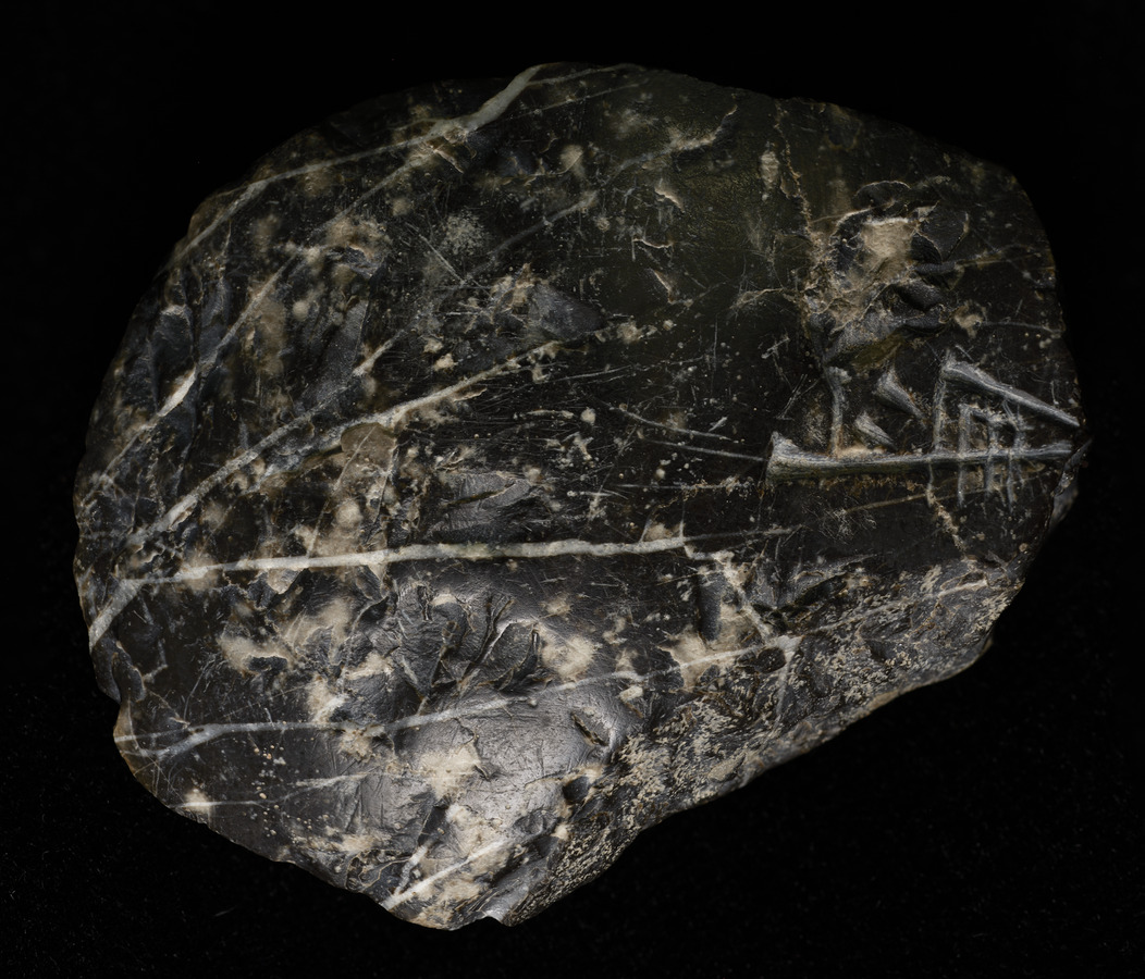 Although referenced as a cuneiform tablet in listings, this item is made from black stone with white veining, possibly diorite. It is shaped and has several scratch marks that may be manmade. There is a mark resembling a triangle or arrow visable.