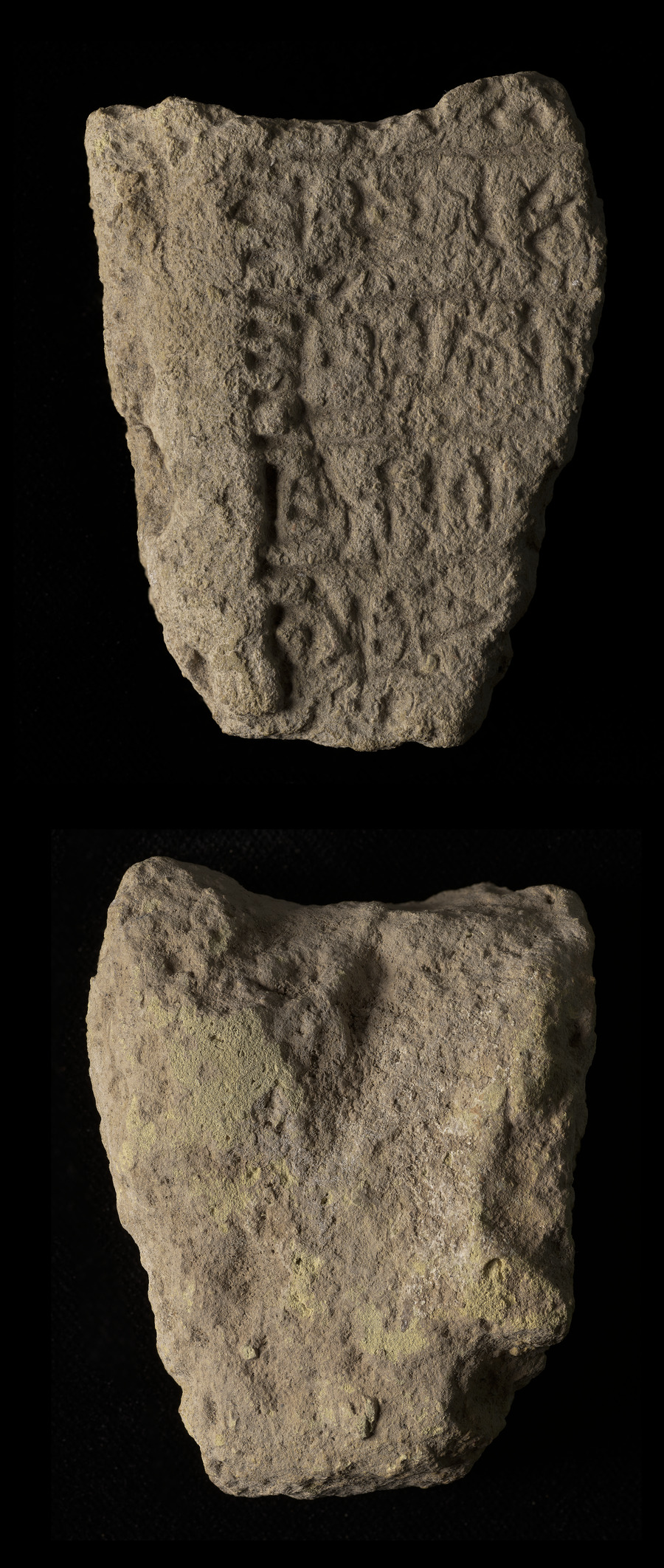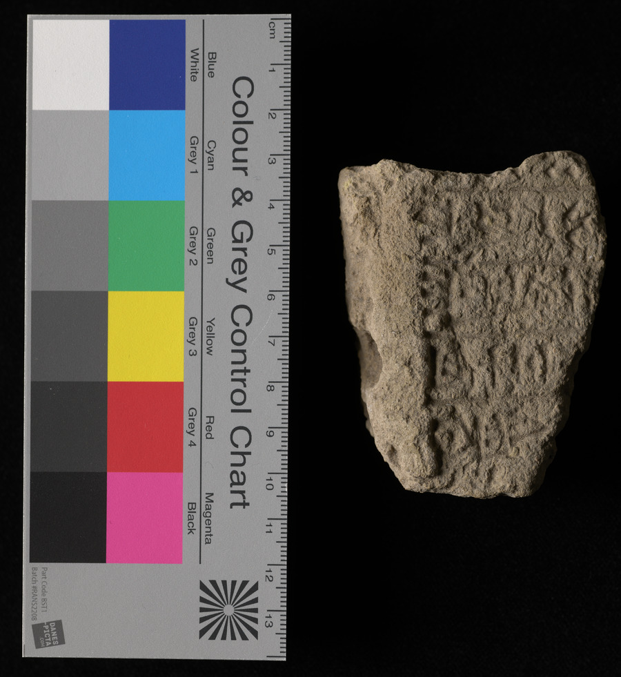 Part of a large cuneiform tablet in grey clay with large script on one side.