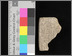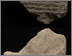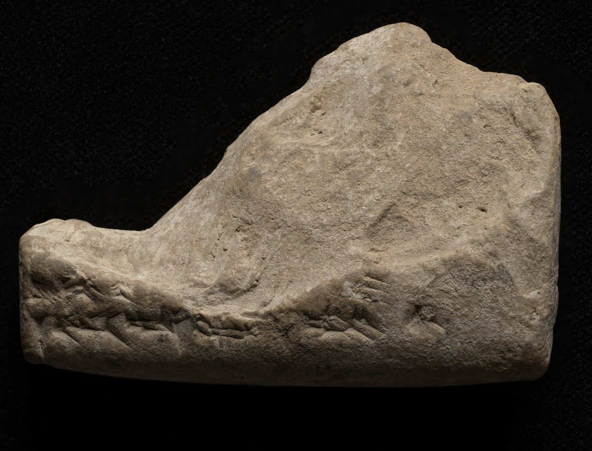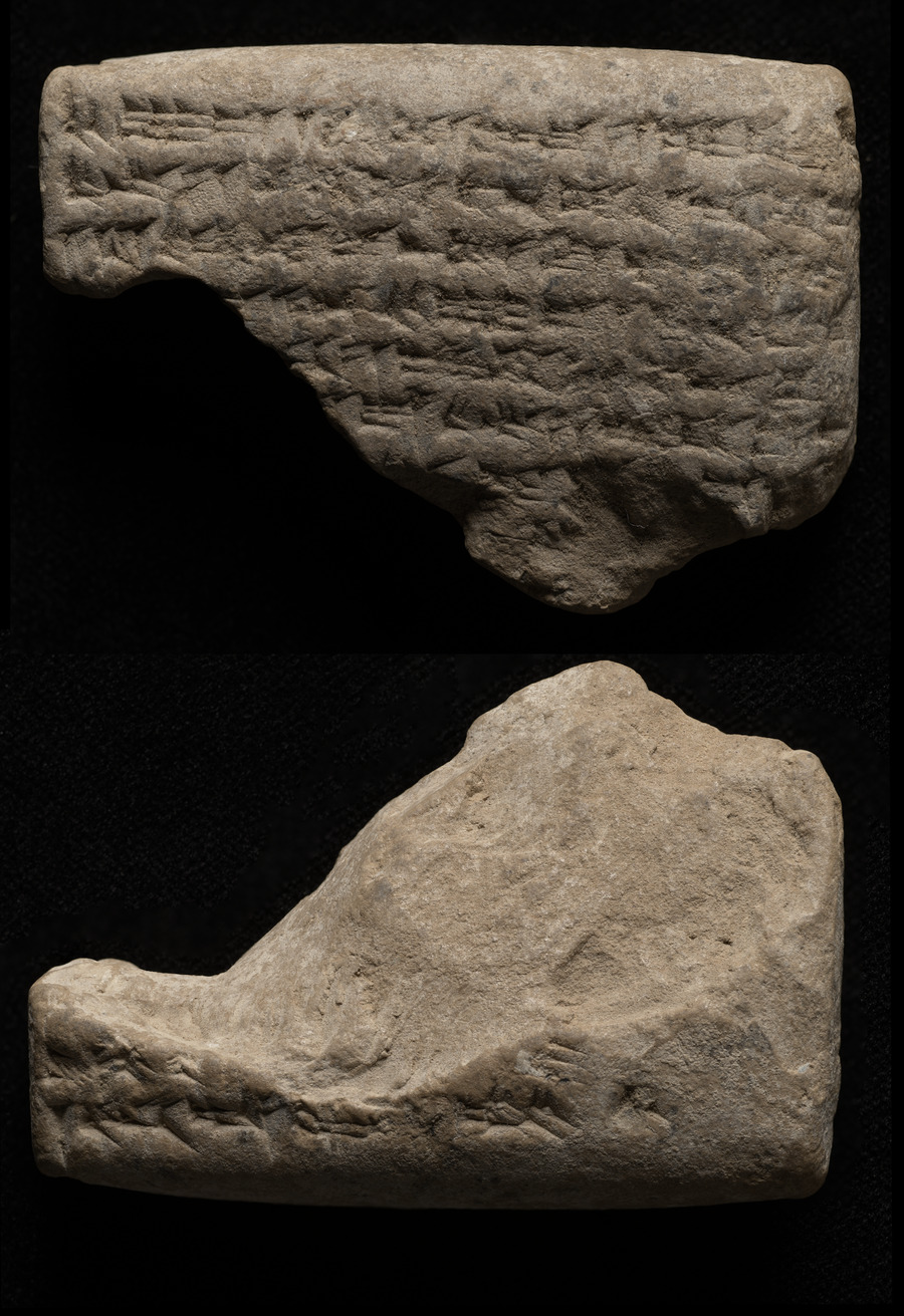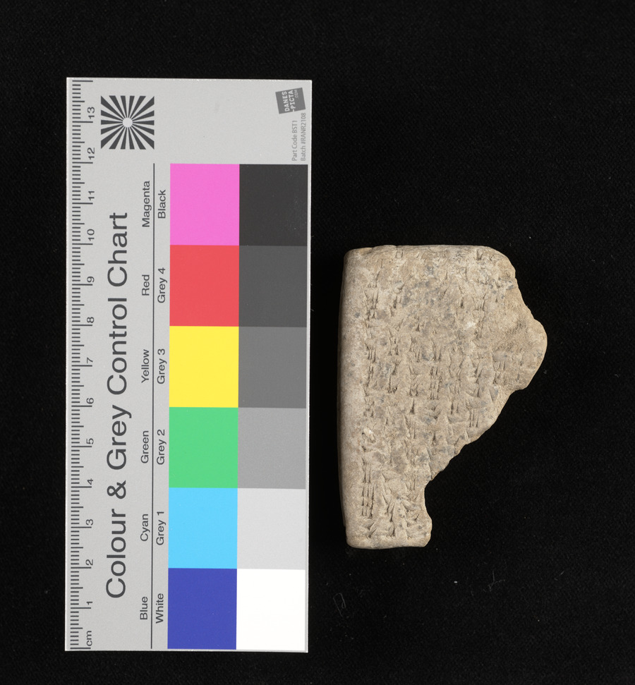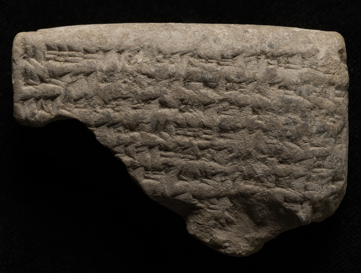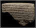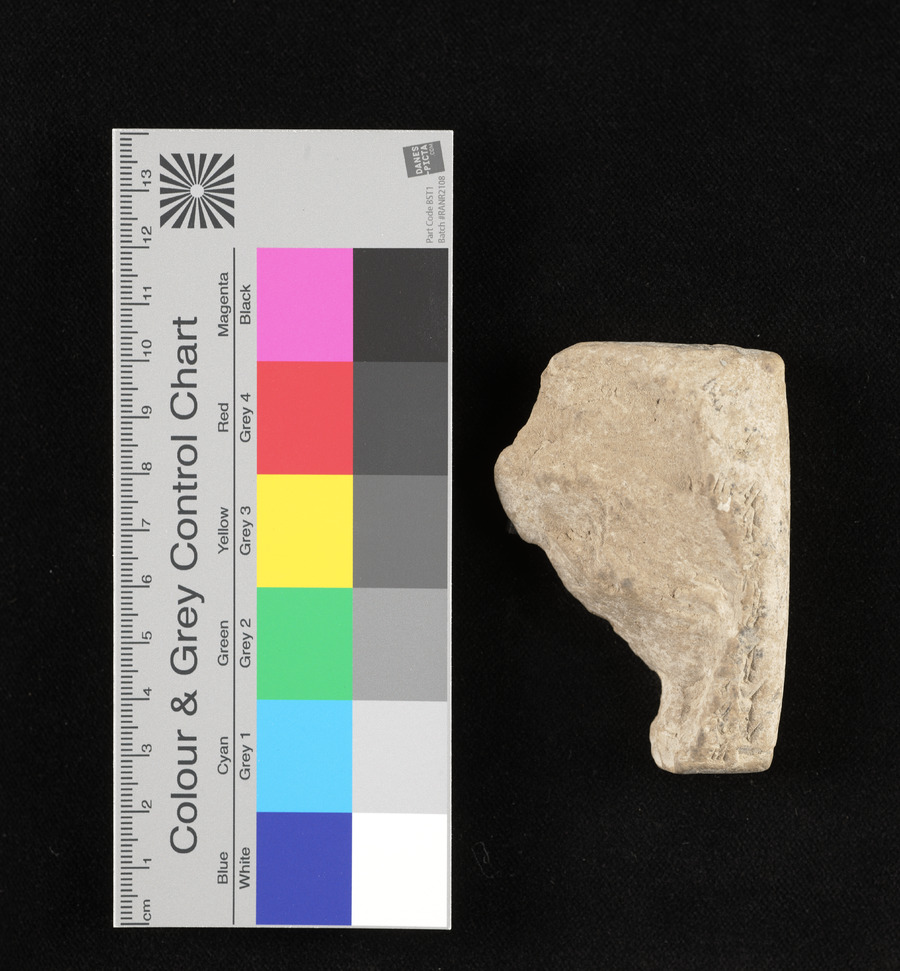 A section of a cuneiform tablet in pale clay with script on one side, the other side is broken away.