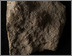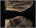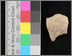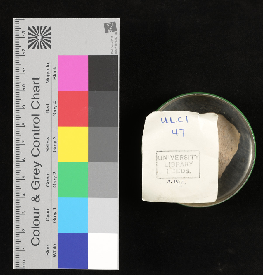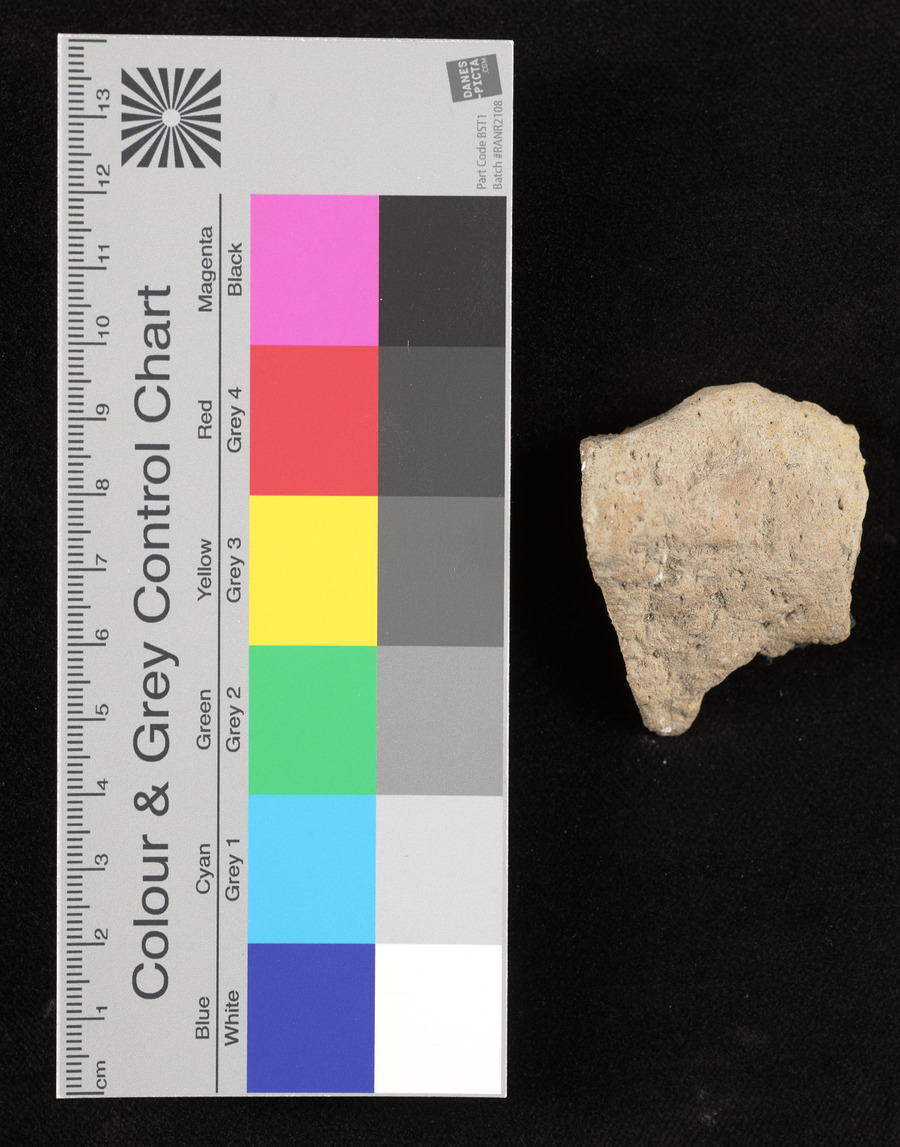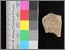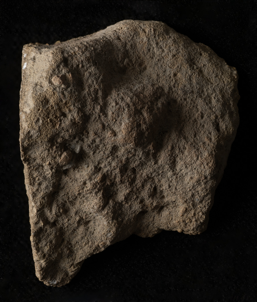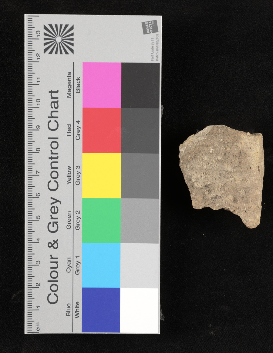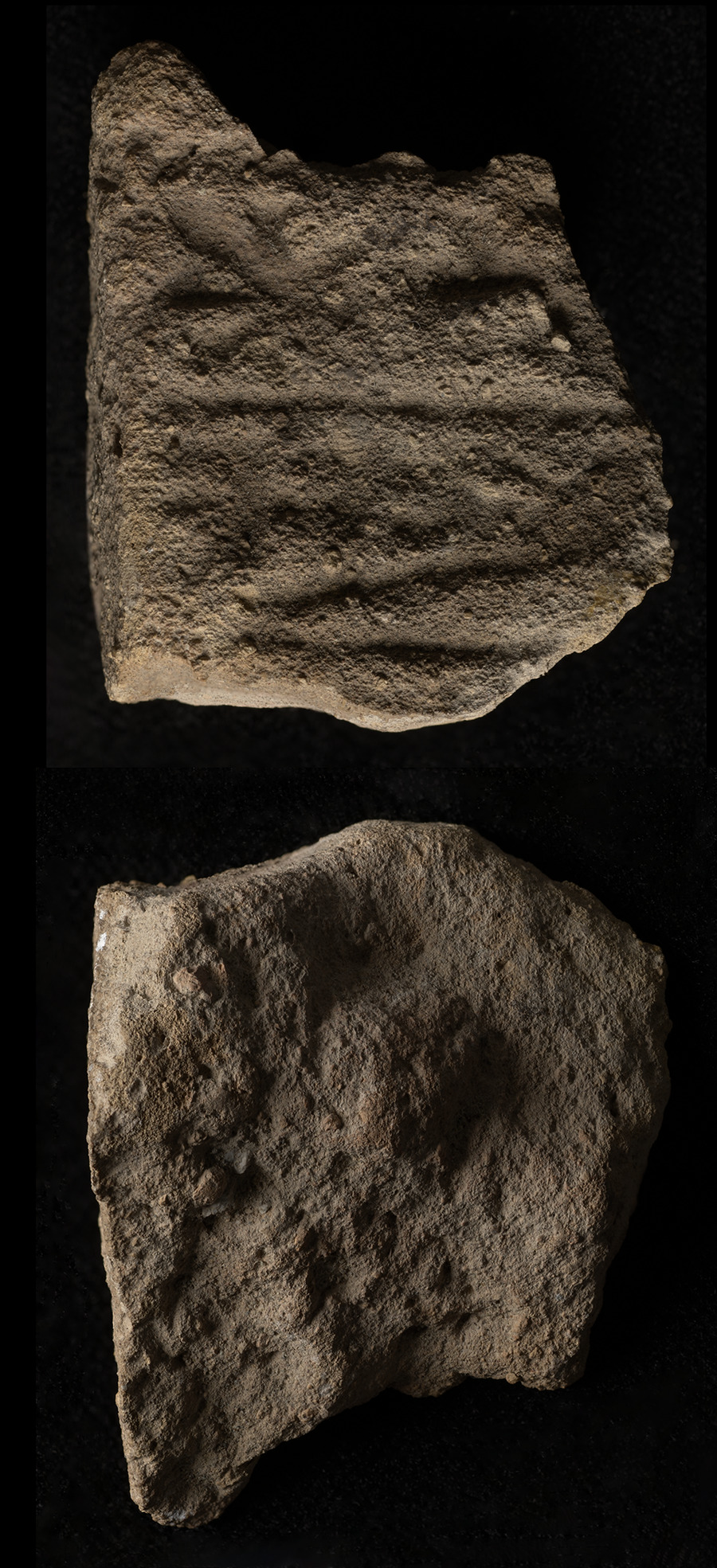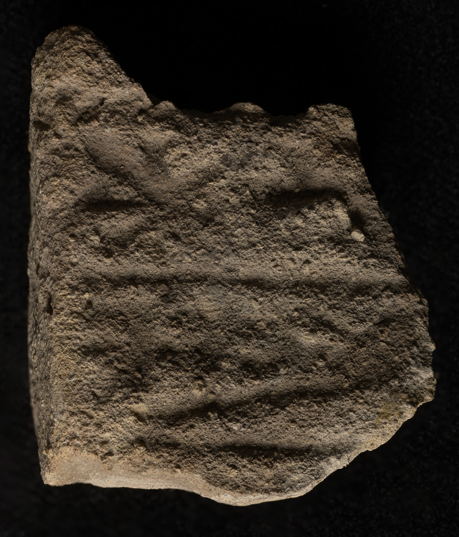 A section of a grey clay cuneiform tablet with small amount of script on one side.