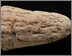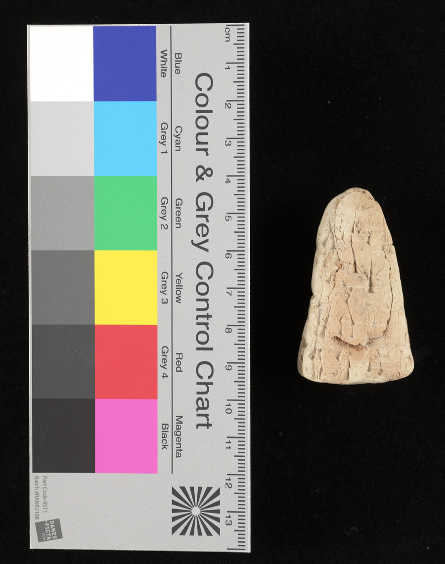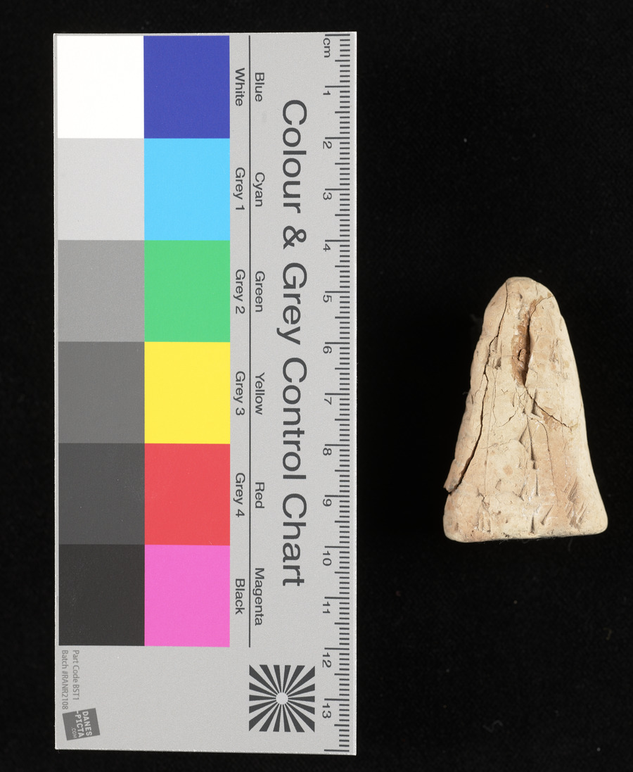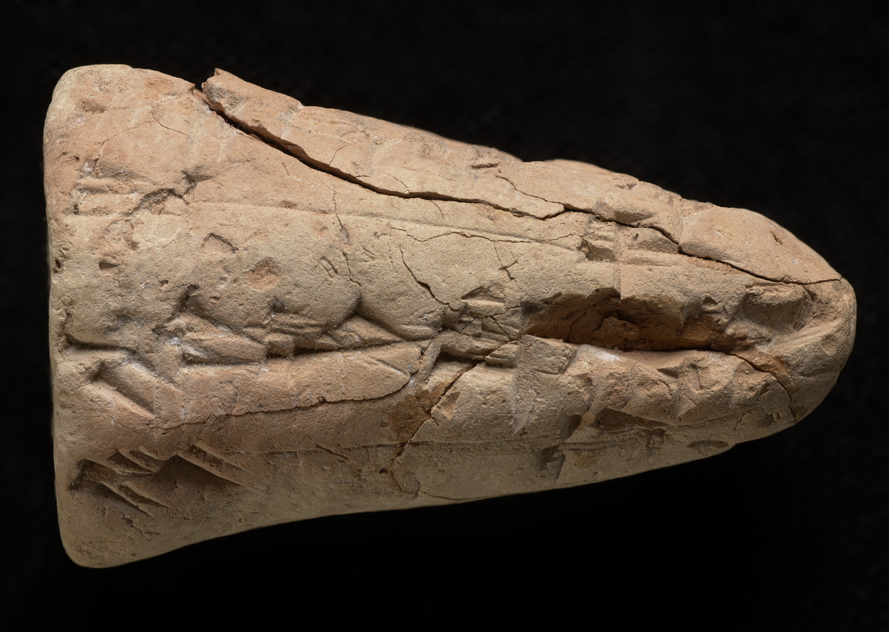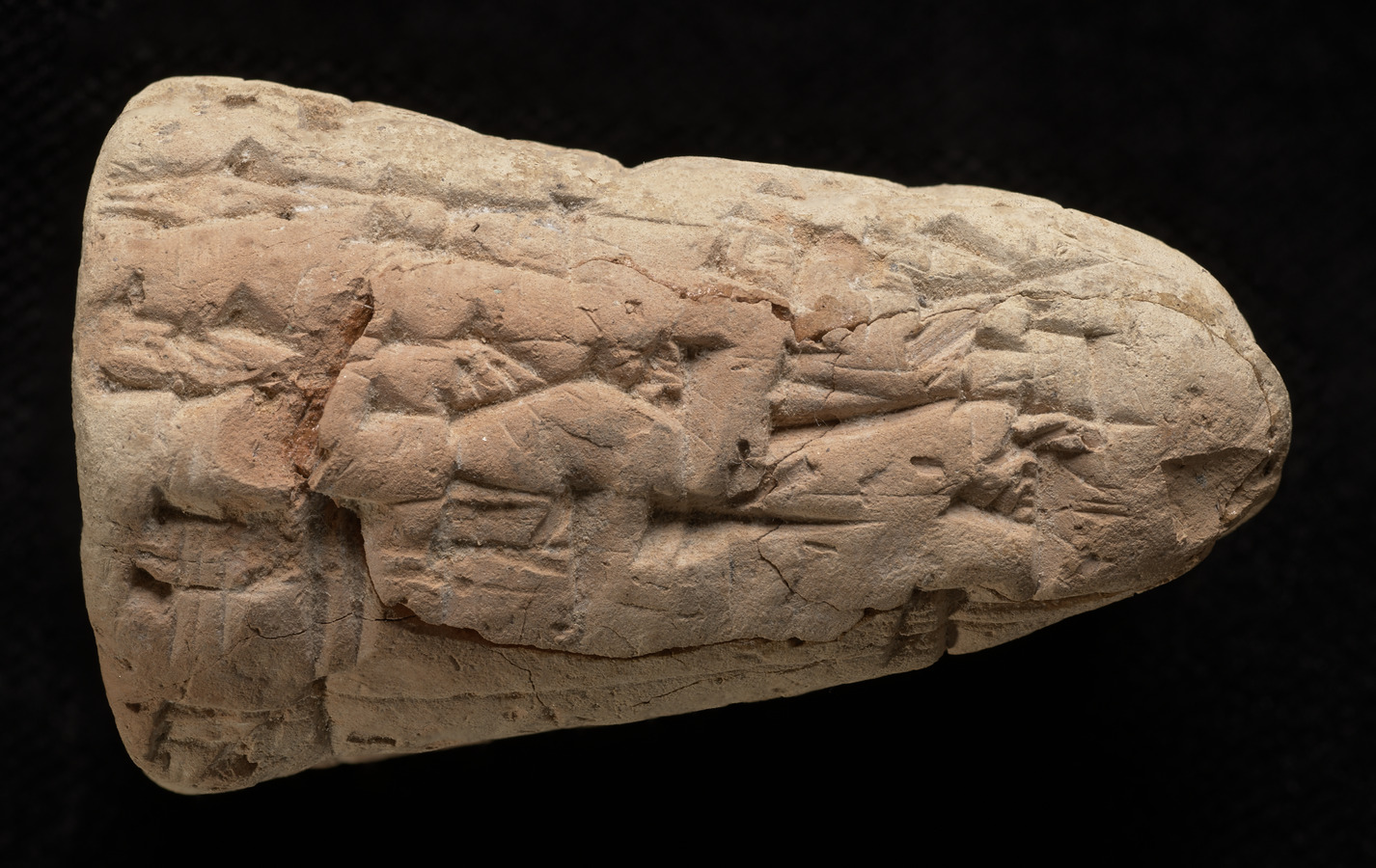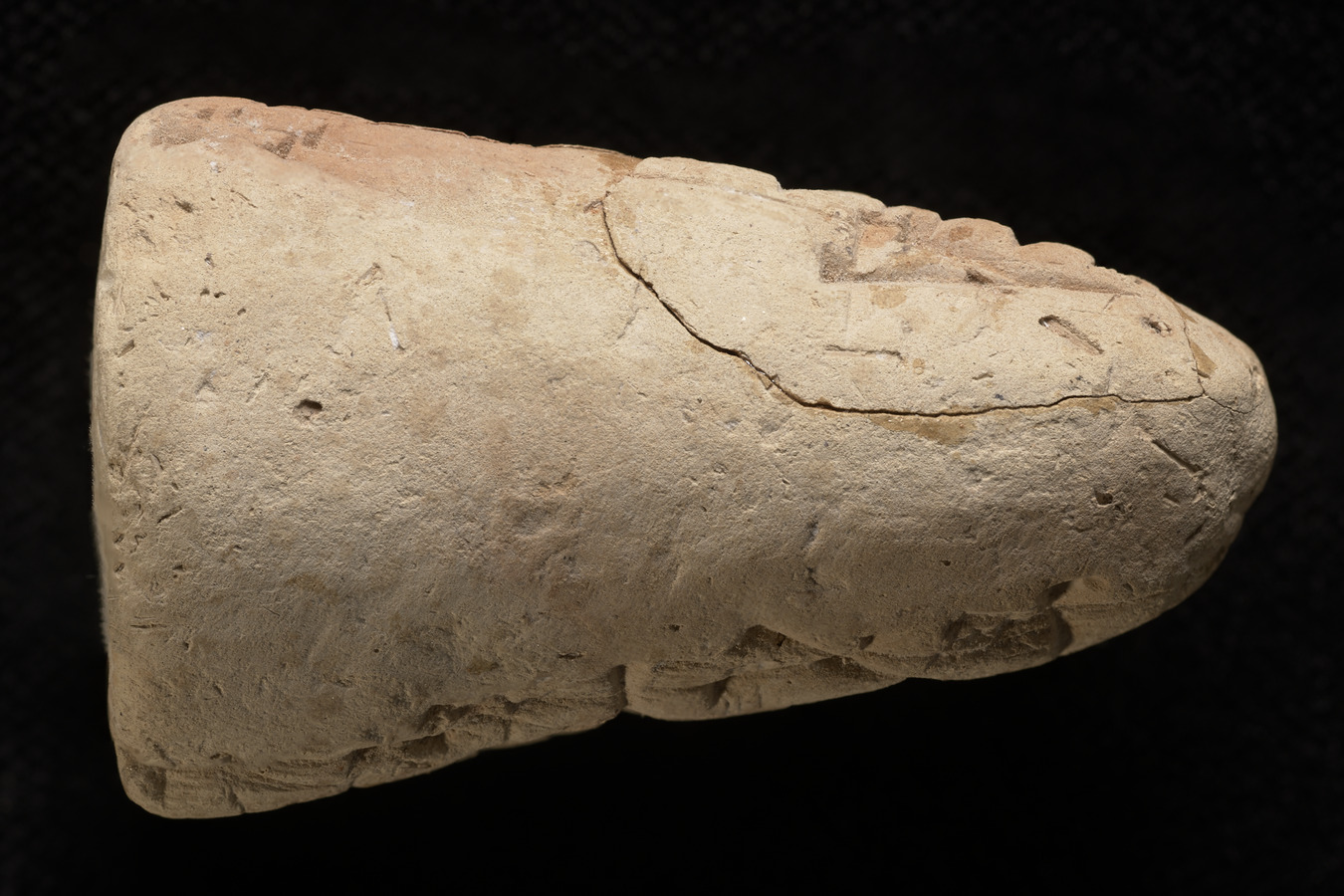 A cone shaped cuneifrom tablet in pink clay. It had been broken and repaired, showing a crack along the repair. Script around most of the tablet. This may be a foundation cone.