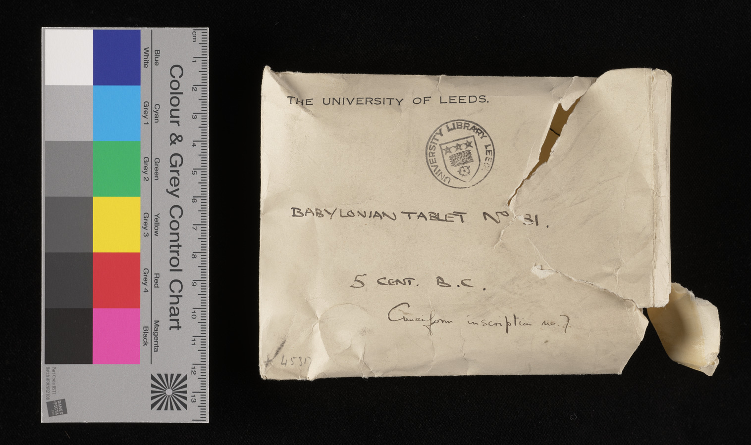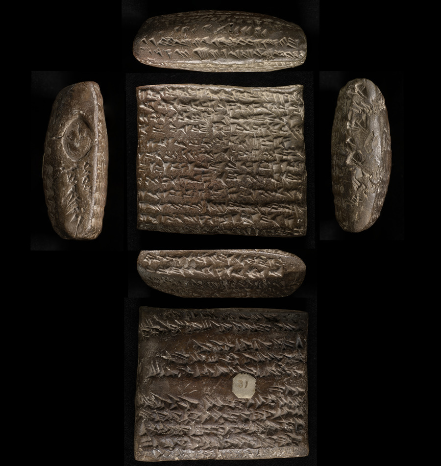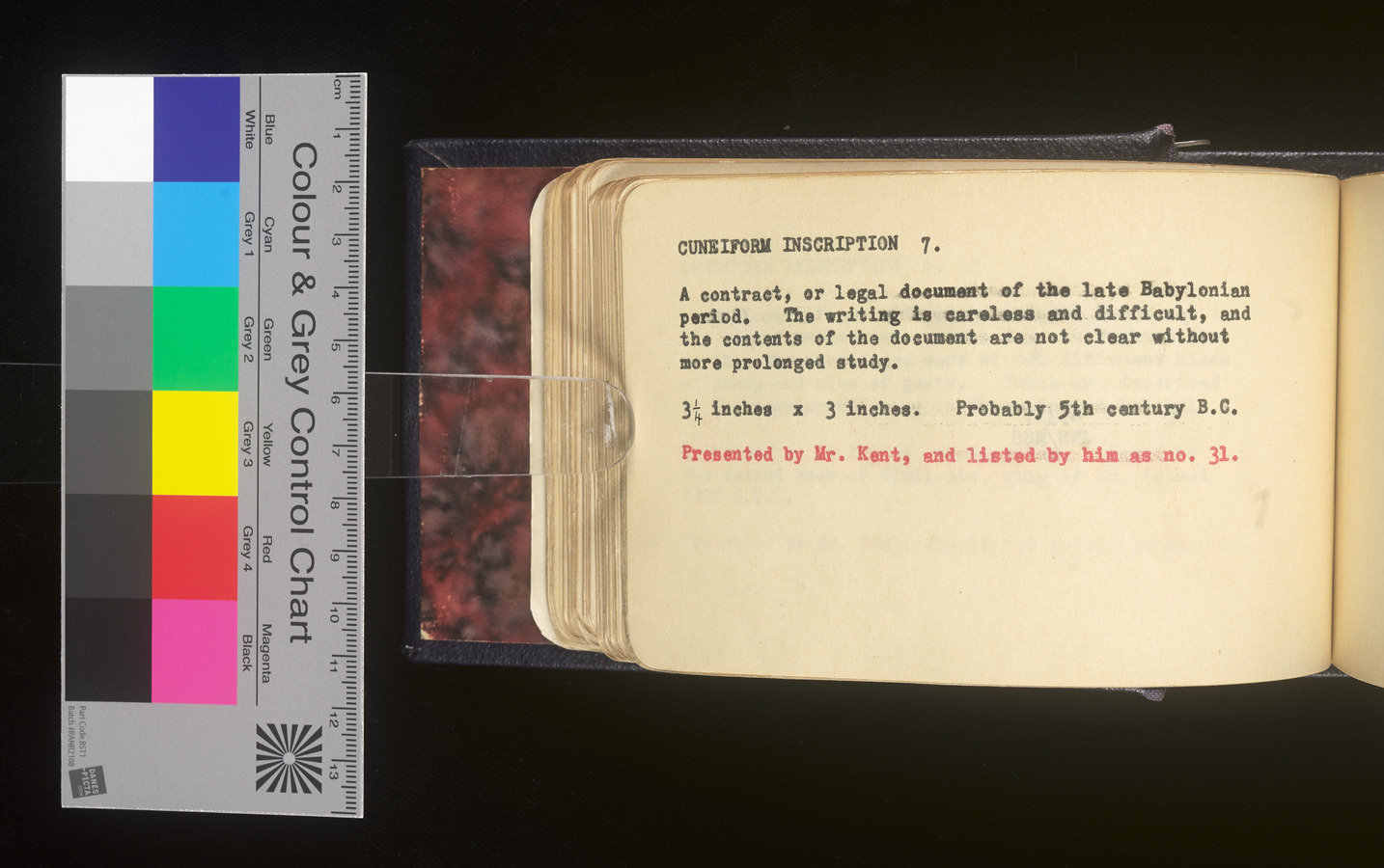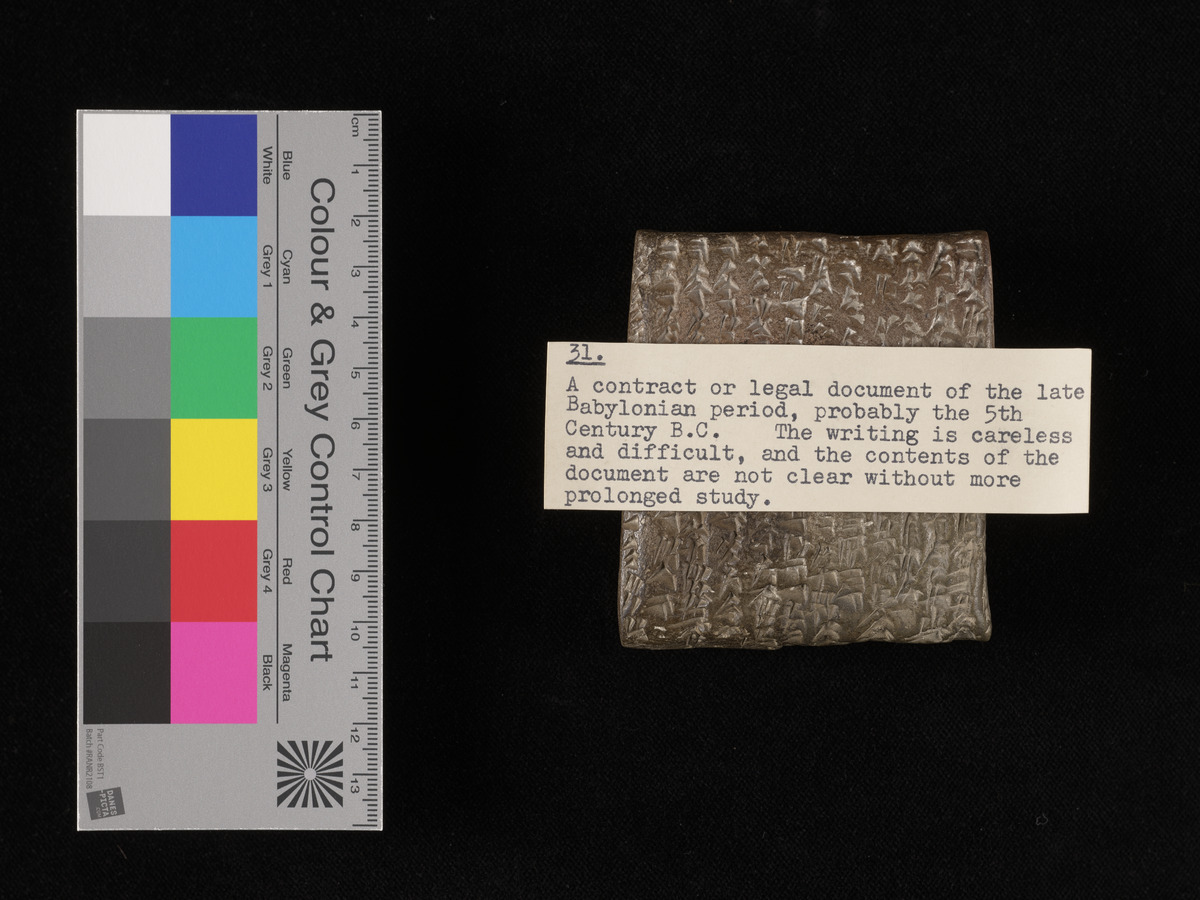 Label enclosed reads: "31./ A contract or legal document of the late Babylonian period, probably the 5th Century B.C. The writing is careless and difficult, and the contents of the document are not clear without more prolonged study."