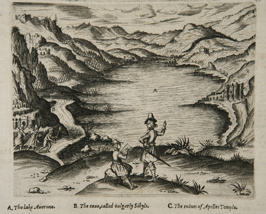 • Title: An image of a lake surrounded by mountains and castles. In the forground 2 figures; one seated one standing, are surveying the view; to the left a group of three are in procession with the leader holding a lit torchlight. Three areas are labelled A-C with a legend at the bottom citing Lake Averno, the caue Sibyls and Apollo's temple.