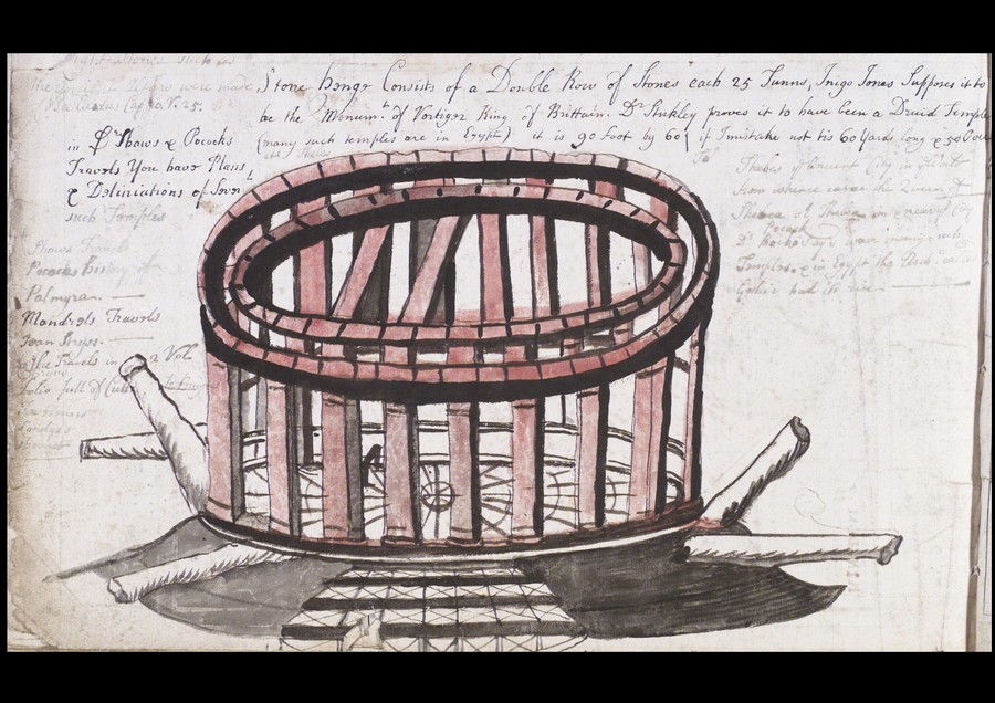 - Title: A hand drawn and coloured sketch of Stone Henge, with a description handwritten around the drawing