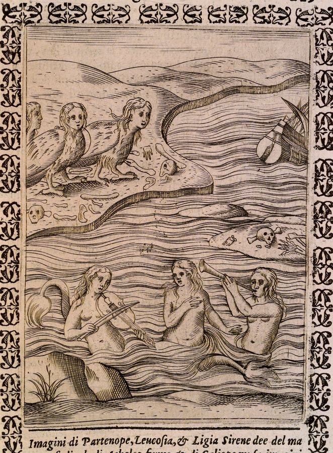 - Title: Three sirens waist-deep in water, playing musical instruments, watched by three harpies on shore, surrounded by human bones. In the background are a sinking ship and an islet covered in bones