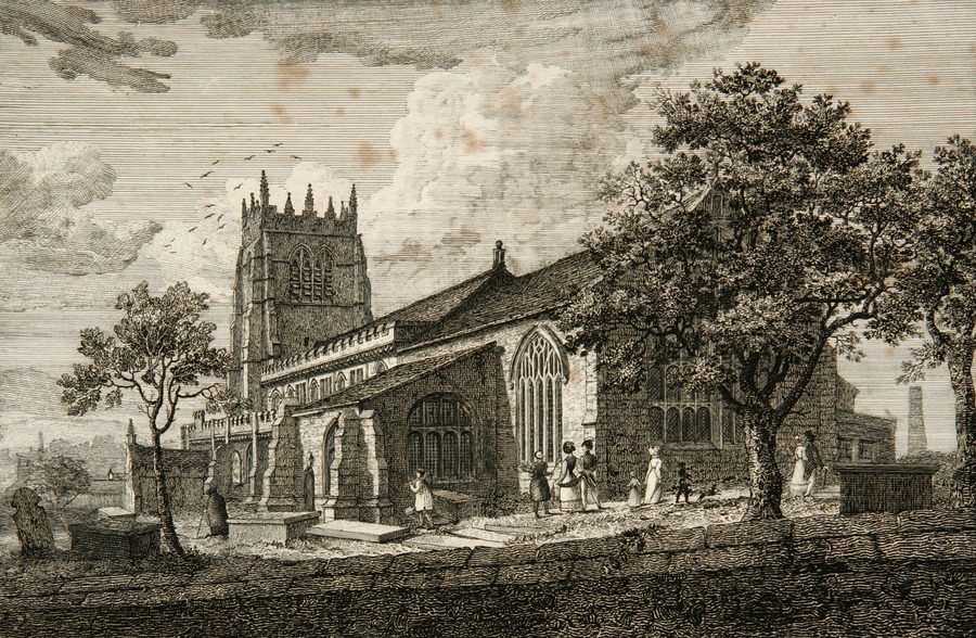 Bradford, ext. from S.E. depicts various figures walking around the church Text at bottom reads S.E. View of the parish church, Bradford Engraved from sketch taken Oct.22 1828