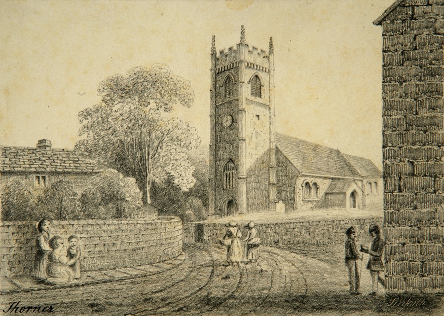 - Title: Thorner, exterior from S.W. pre-1855 restoration inscibed Thorner2 bottom left, and signed by artist bottom right. Figures occupy foreground.