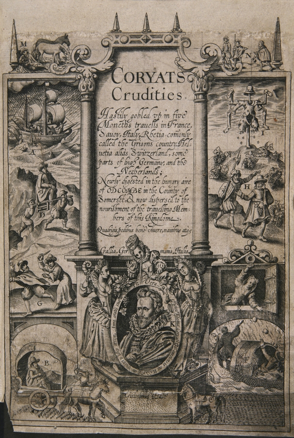 - Title: The title and descriptive text is framed by two greek style pillars in the centre of the image and surrounded by various comical scenes which have been given an aphabetical letter. M & N are at the top, B, L & F are across the bottom.