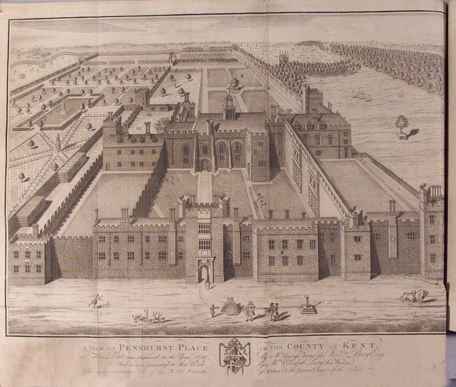 The plate has the caption 'A VIEW OF PENSHURST PLACE IN THE COUNTY OF KENT. This Plate was engraved in the Year 1747, by Mr. George Vertue, for Willm Perry Esq. And is now presented to this Work by Mrs. Elizabeth Perry his Widow, The only remaining Heir of the Noble family of [S]idney, & the present Owner of this Seat.' The tears at the bottom of the original print have been digitally improved.