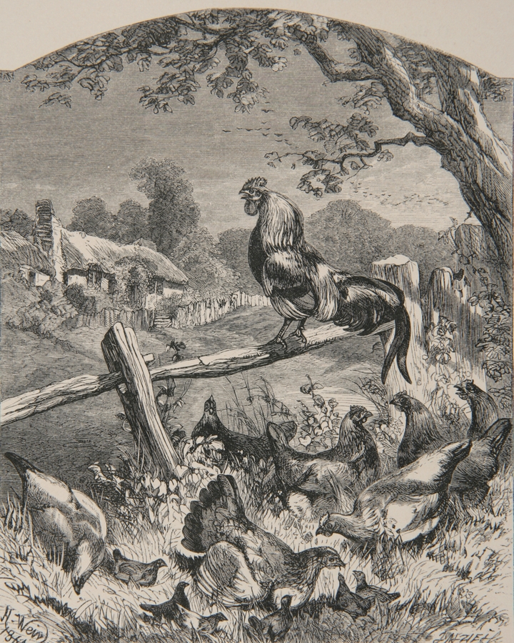 The illustration shows a cock on a fence. Some hen and other poultry with their offspring are below him in the grass, most of them looking for food. There is a cottage in the background to the left, and at the right hand side of the image is a large tree.