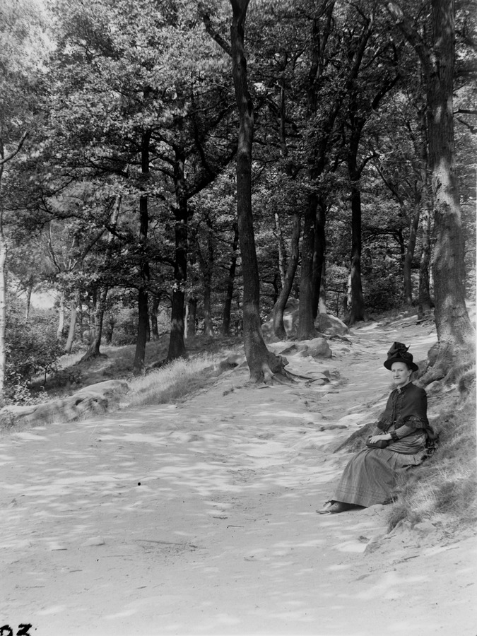 • Title: Woman seated in forest, by rock (Meanwood)