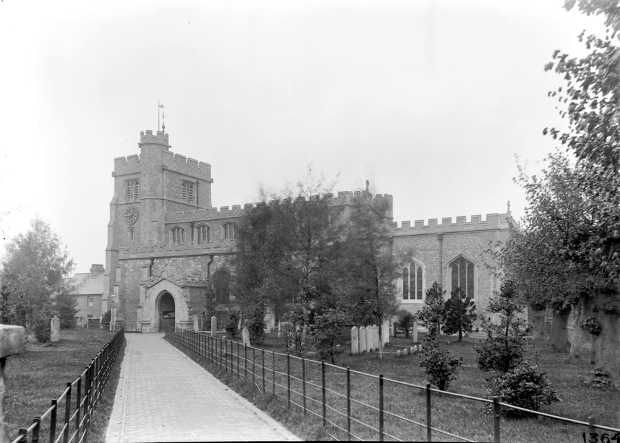 - Title: Tring: Church. A B&W photograph of a Church in Tring. A road with railings either side starts from the foreground and leads to the background and the entrance to the church.
