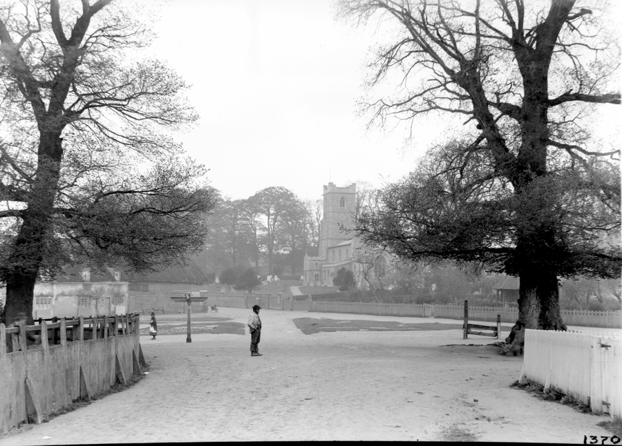 - Title: Aldbury: Church. A lone figure stands in the middle of a crossroads. The church is in the background and there is a set of stocks to the right, and sighnpost to the left. Two trees frame the image.