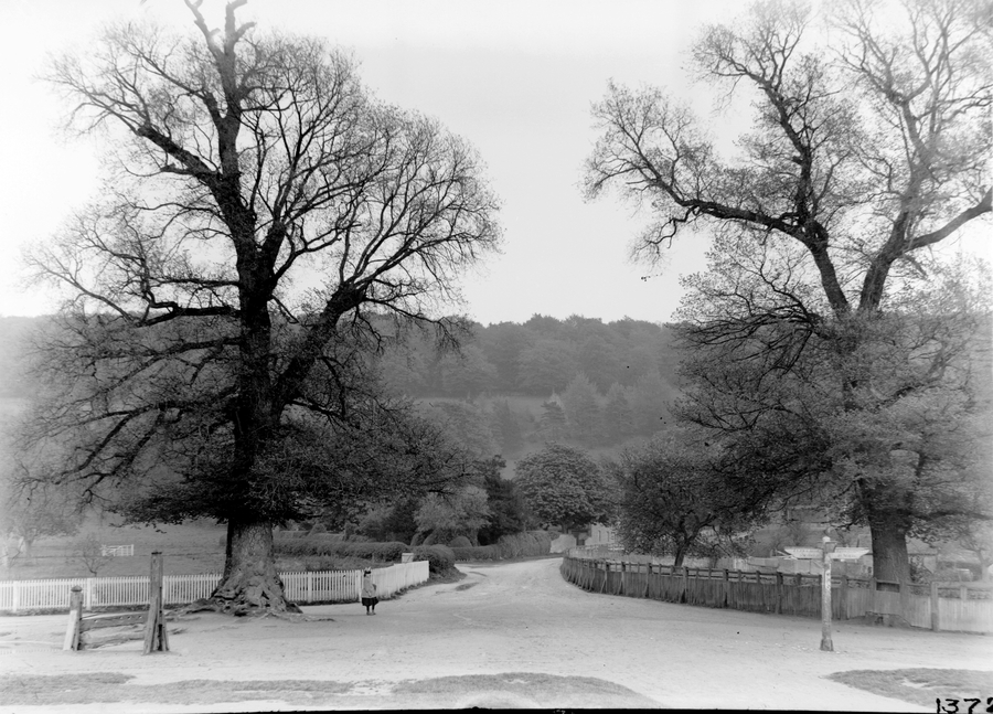 - Title: Aldbury: Stocks and Trees. A view of a crossroads flanked by two trees. There are some old stocks to the left of the frame and a signpost to the right.
