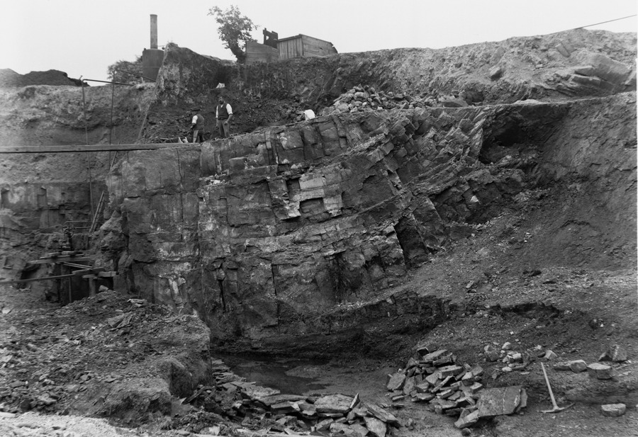View of Meanwood quarry; men working at top of rock face