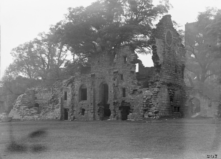 • Title: Exterior view of Kirkstall Abbey remains. Backdrop of trees.
