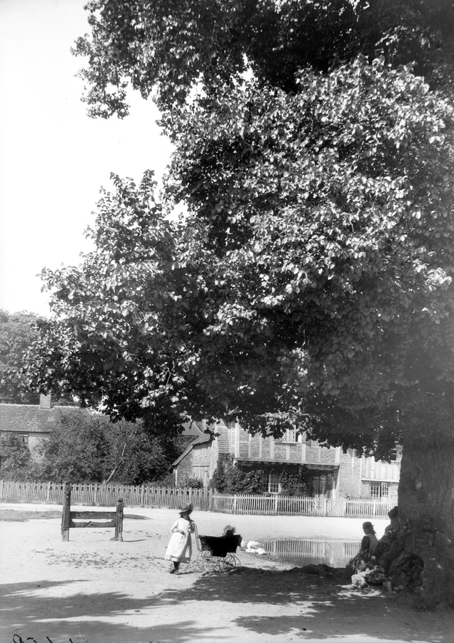 Aldbury Various. A group of children are under the oak tree in the village square. One child is wearing a white dress and coloured hat, holding a pram. A set of stocks are visible.