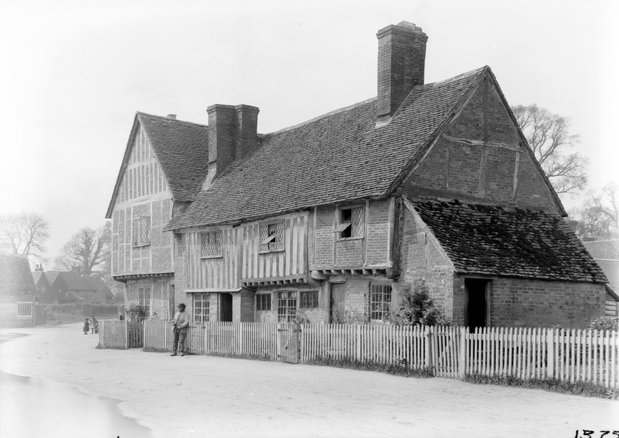 - Title: From Vol 5 Slide 1375 Aldbury: Old Cottage. A view of a Tudor style cottage of unknown date. Three of the windows are open and there is a gentleman stood in front of the fence