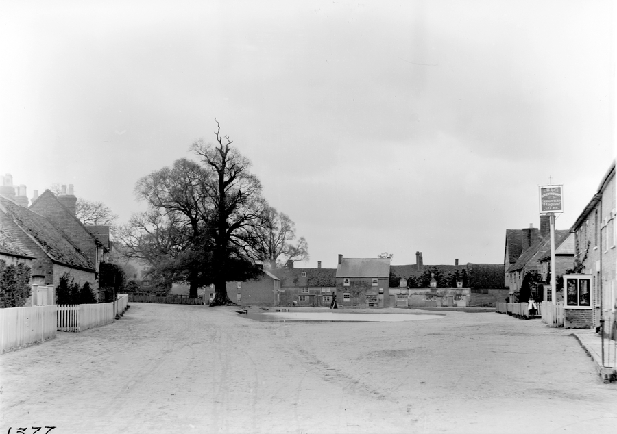 From Vol 6 Slide 1377 Aldbury Village from Pond. A view of a village. There is a pub called 'The Greyhound' to the right of the frame, a tree in the centre and cottages and buildings spanning from left to right.