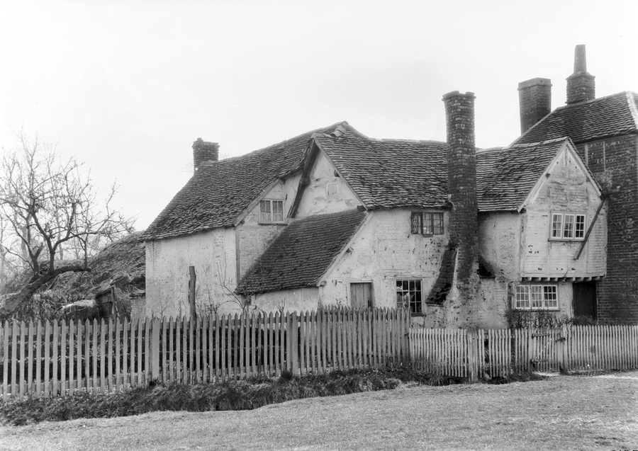 Tring Park, gate from Avenue . A large whitewashed cottage with dilapidated slate roof, four chimneys and a haystack visible in the background. A wooden picket fence and ditch surrounds the building.