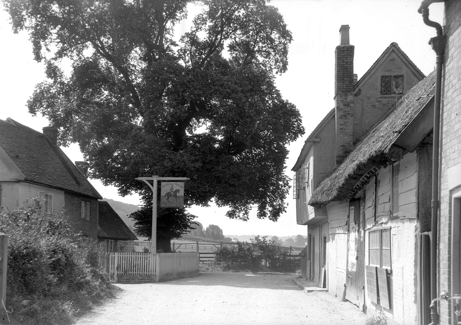 Tring Park, gate from Avenue . Image of a village street lined with buildngs. A pub sign is visible on the left hand side of the frame in front of a huge tree.A drainpipe on the far right hand side of the image is clearly visible