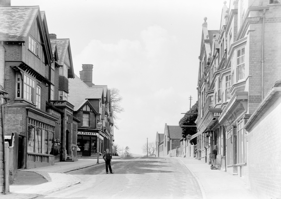 - Title: Tring Highstreet looking up showing the shops and a male figure