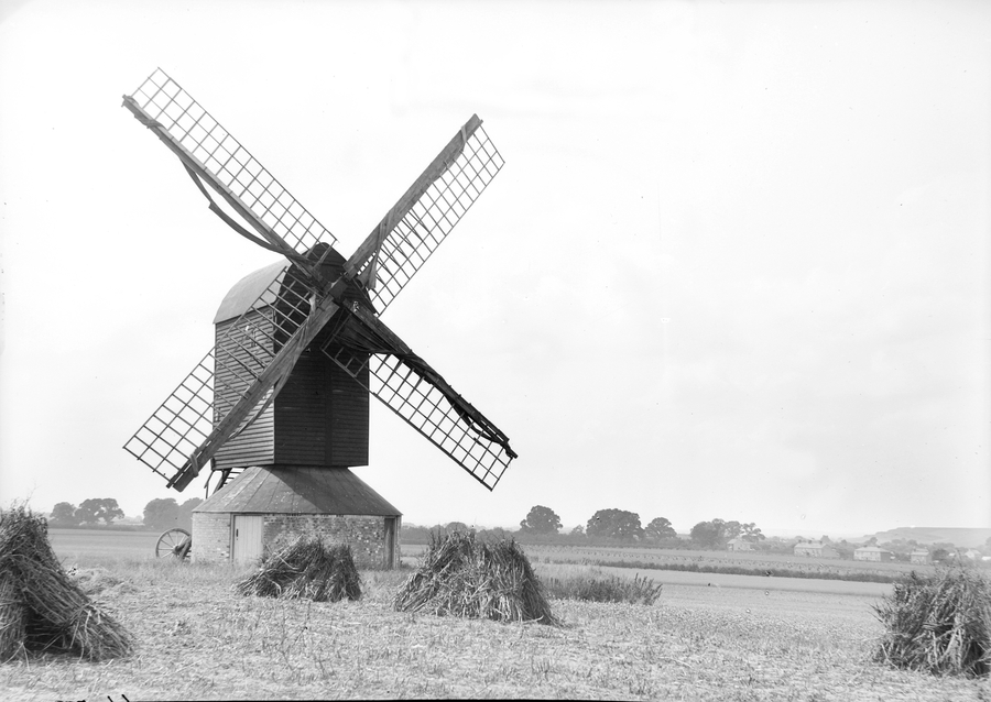 - Title: Pitstone Windmill. A windmill with the sails facing the front. There are four haystacks clearly visible in the field surrounding it. A small wheel attached to the windmill can clearly be seen .