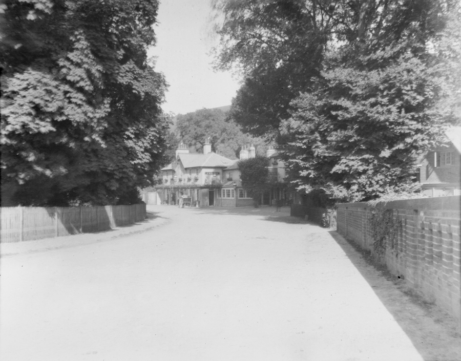 • Title: Burford Bridge, a hotel viewed from down a lane