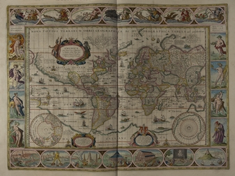 Illustrated map of the world including images of ships and sea monsters, and showing north and south views. Illustrated border showing: across the top: planets depicted as gods and goddesses in chariots; left hand side: the four elements as figures; right hand side: four seasons as figures; across the bottom: seven wonders of the world. All images have latin titles.