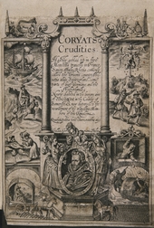 Title: A Sciographie or modell of that stupendious vessell which is at this day shewed in the palace of the Count Palatine of Rhene in the citie of Heidelberg Image of Coryat on top of 'The Great Tun' A large cask with a group of figures gathered around it.