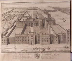 A view (almost aerial) of Penshurst Place, including several people and animals in the grounds.