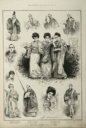 The title: Sketches from The Mikado at the Savoy Theatre appears at the bottom of a full page dedicated to the production, comprising drawings and a cast list of thirteen characters from the play.