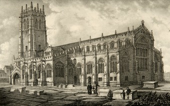 Halifax, exterior from S.E., pre-1850 Halifax Parish Curch printed on middle bottom, Printed by Engelmann, Graf, Coindet & Co on bottom right Draw from the church, and engraved on stone by N.Whittock, 24 Garnault Place, London on bottom left, figures in churchyard in foreground.