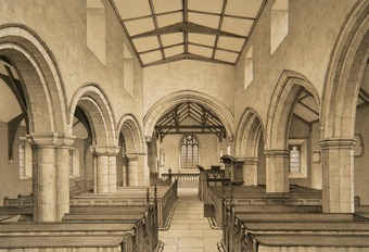 Kirk Deighton. interior looking East, as restored in 1849 The Nave and Chancel of Kirk Deighton, Yorkshire inscibed bottom of picture, Restored 1849. Perkin & Backhouse, Leeds on bottom left Pulleyn & Hunt, Park Row, Leeds on bottom right.